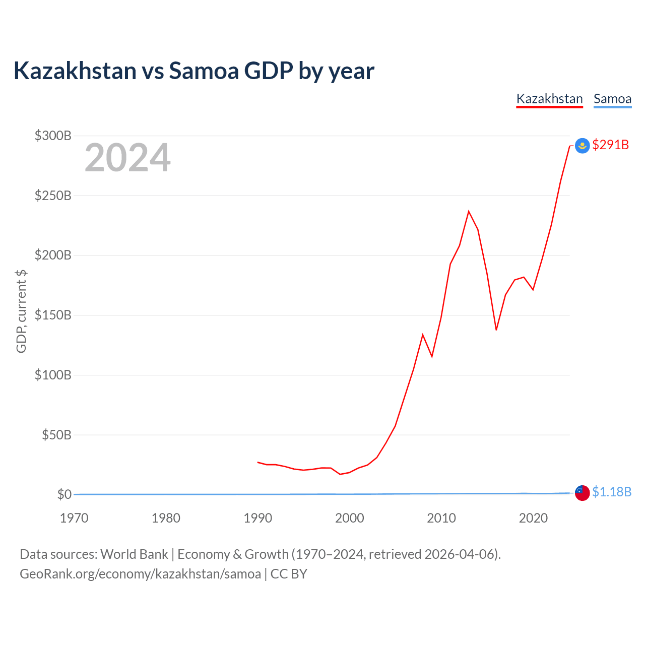 Kazakhstan has a GDP of $291B compared to $1.18B for Samoa, ranking 48/197 and 185/197 by economy size, respectively.