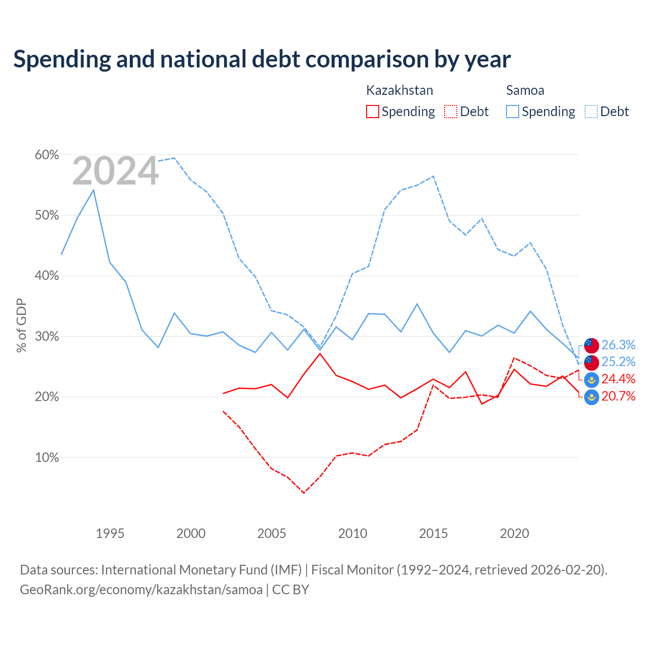 Kazakhstan has $71.1B in government debt (24.4% of GDP), compared to $296M (25.2% of GDP) in Samoa.