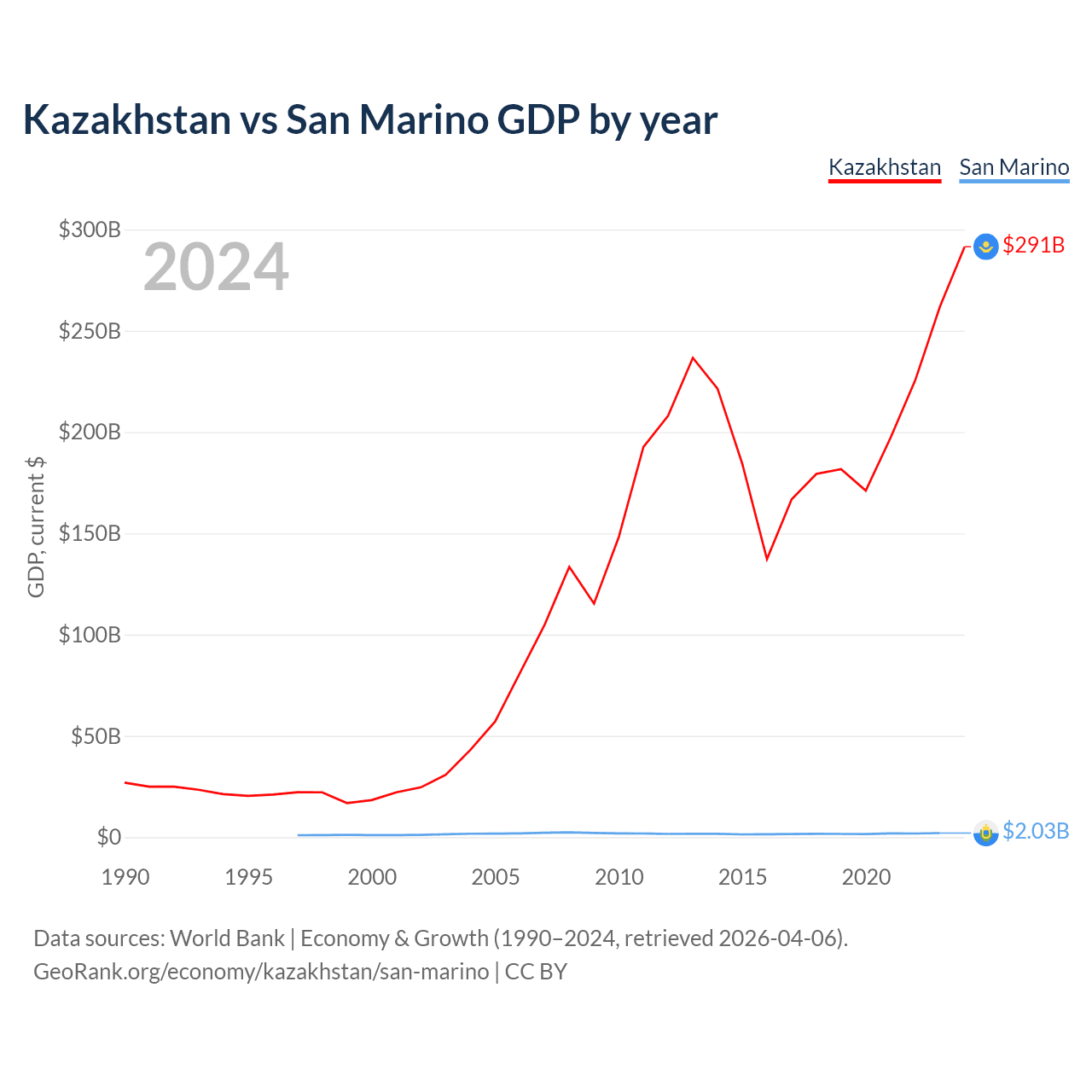 Kazakhstan has a GDP of $291B compared to $2.03B for San Marino, ranking 48/197 and 180/197 by economy size, respectively.
