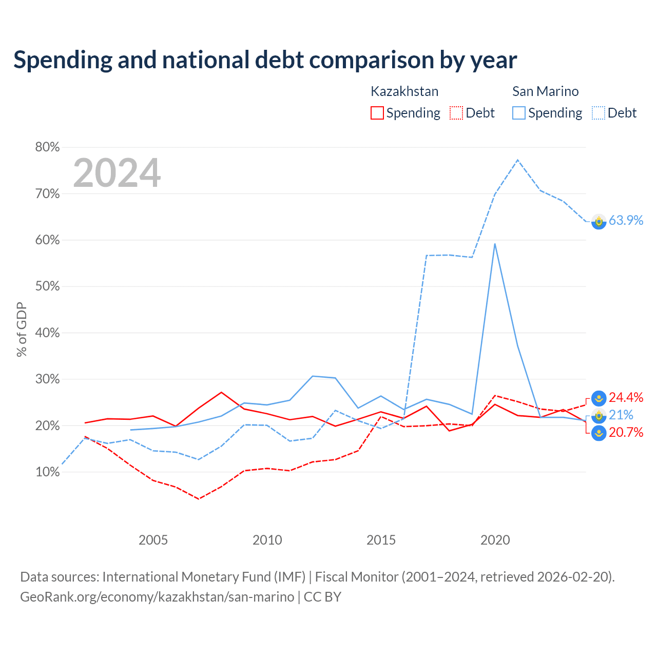 Kazakhstan has $71.1B in government debt (24.4% of GDP), compared to $1.39B (63.9% of GDP) in San Marino.