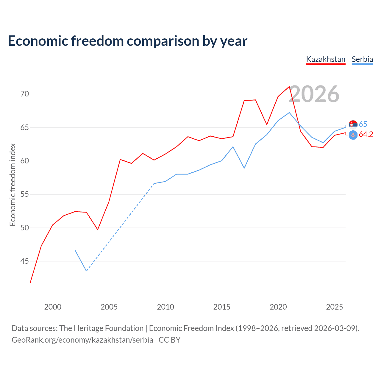 The Economic Freedom Index for Kazakhstan is 64.2, ranking 75/197, compared to 65 for Serbia, ranking 68/197. The chart above displays a comparison of annual changes in economic freedom indexes.