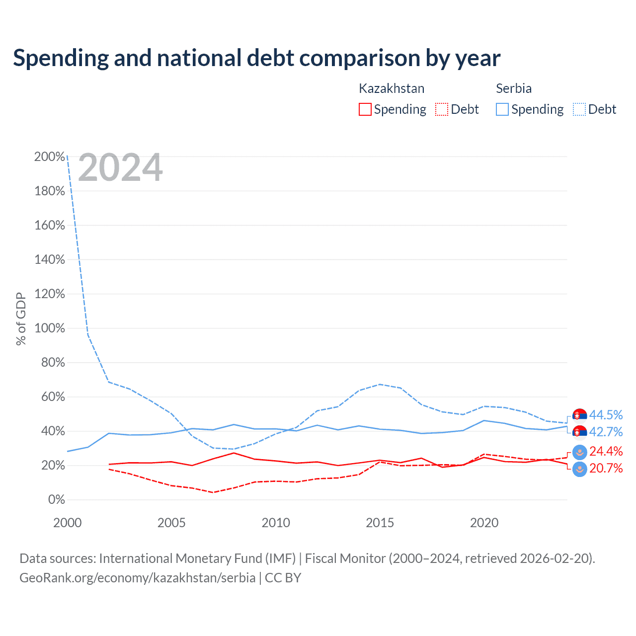 Kazakhstan has $71.1B in government debt (24.4% of GDP), compared to $40.1B (44.5% of GDP) in Serbia.