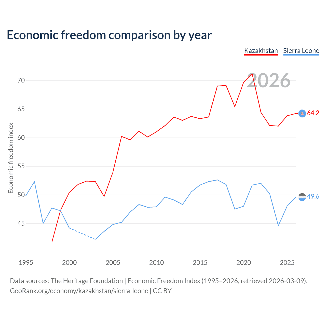 The Economic Freedom Index for Kazakhstan is 64.2, ranking 75/197, compared to 49.6 for Sierra Leone, ranking 165/197. The chart above displays a comparison of annual changes in economic freedom indexes.