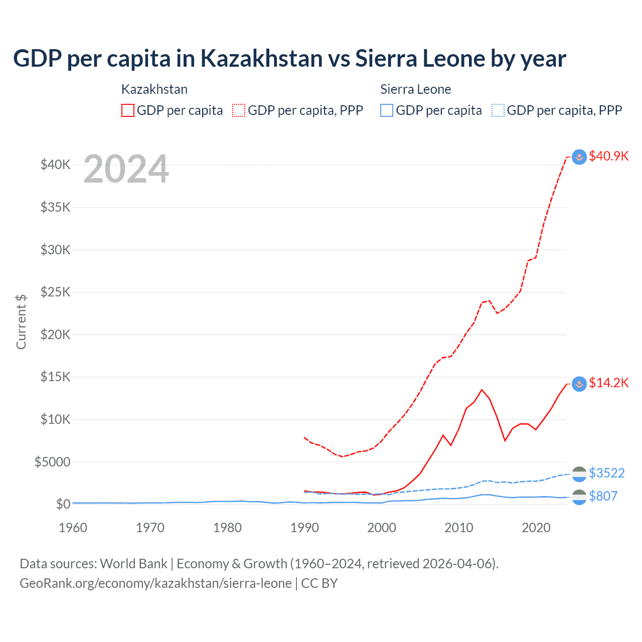 GDP per capita in Kazakhstan vs Sierra Leone by year