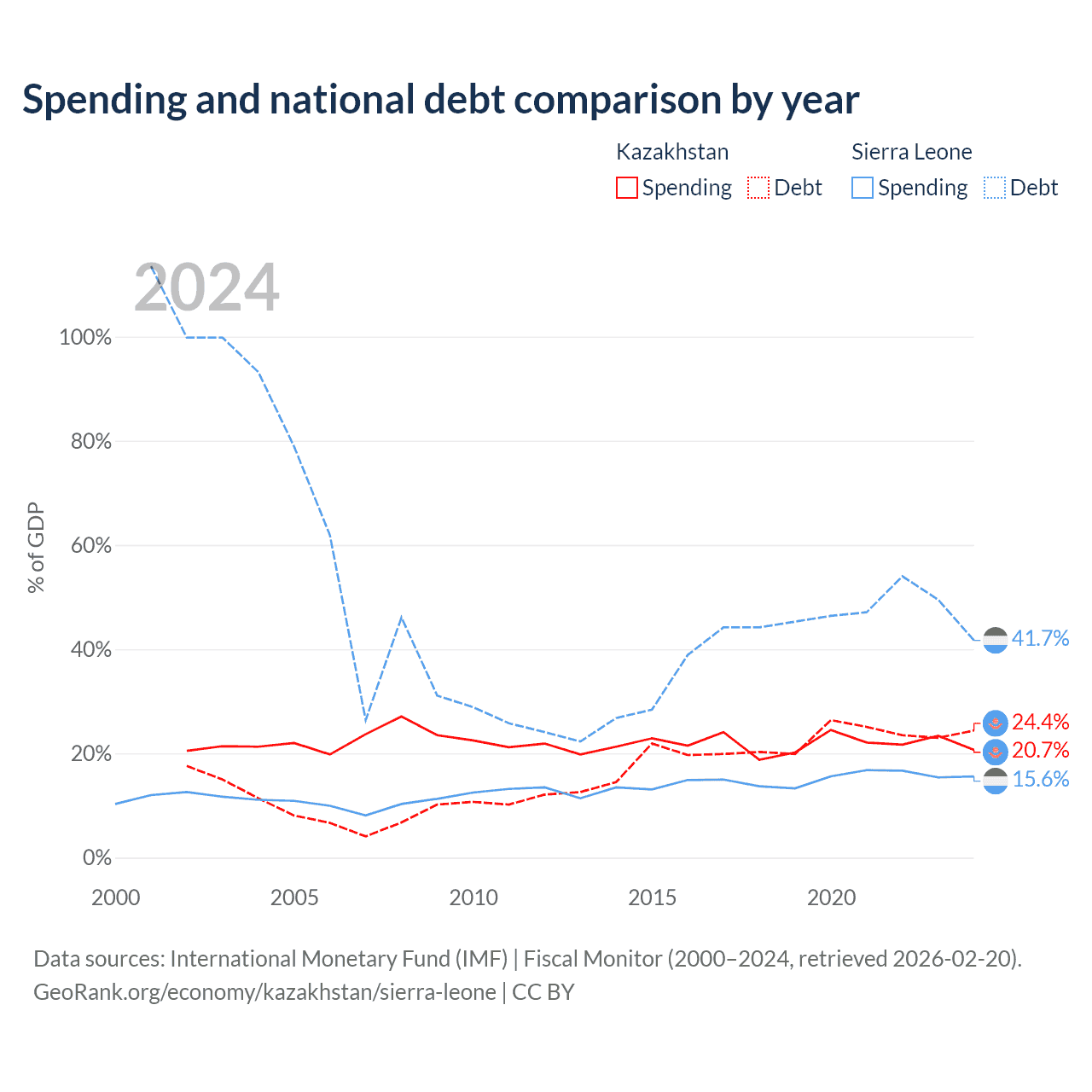 Kazakhstan has $71.1B in government debt (24.4% of GDP), compared to $2.91B (41.7% of GDP) in Sierra Leone.