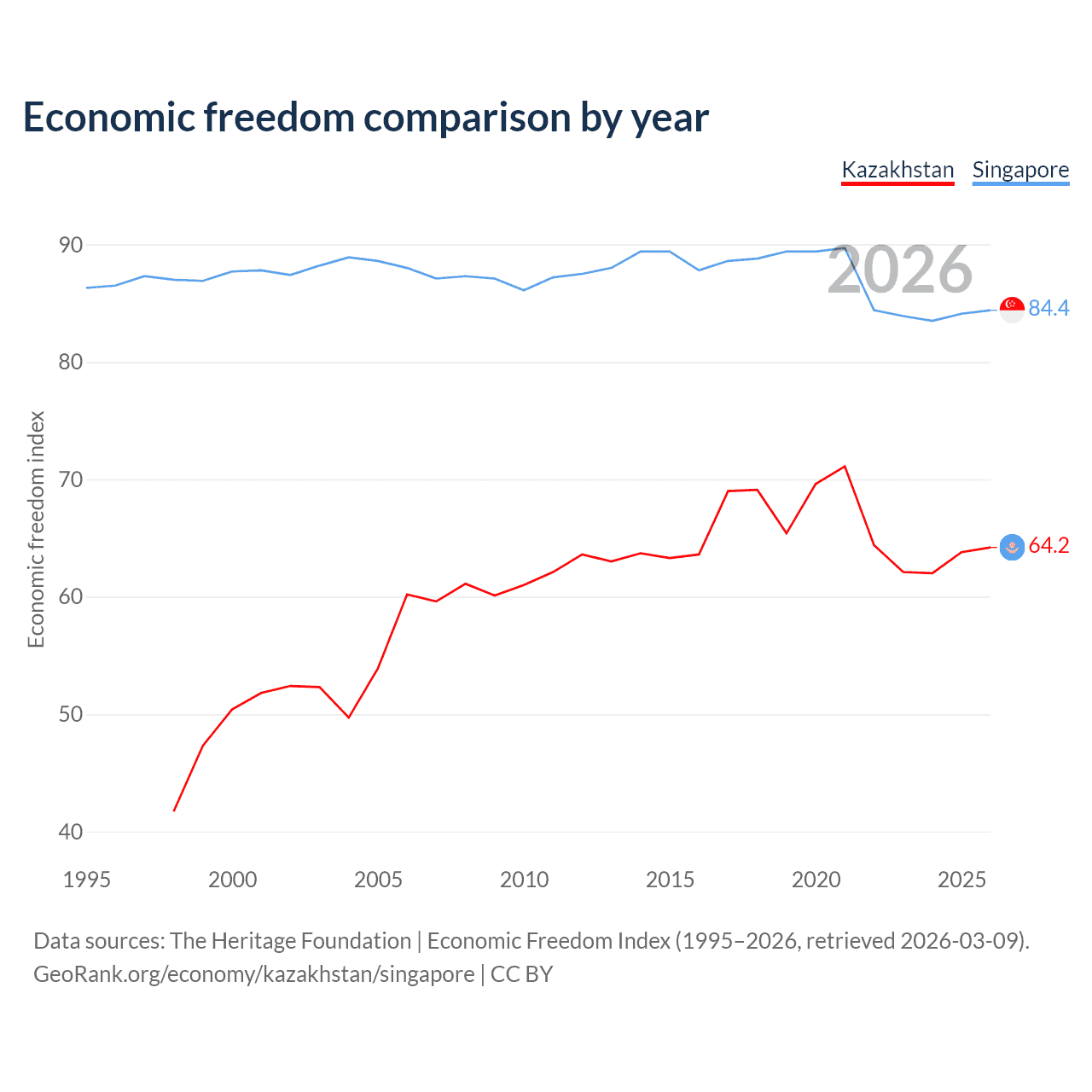 The Economic Freedom Index for Kazakhstan is 64.2, ranking 75/197, compared to 84.4 for Singapore, ranking 1/197. The chart above displays a comparison of annual changes in economic freedom indexes.