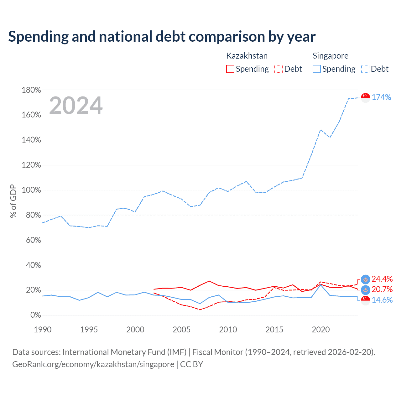 Kazakhstan has $71.1B in government debt (24.4% of GDP), compared to $950B (173.5% of GDP) in Singapore.