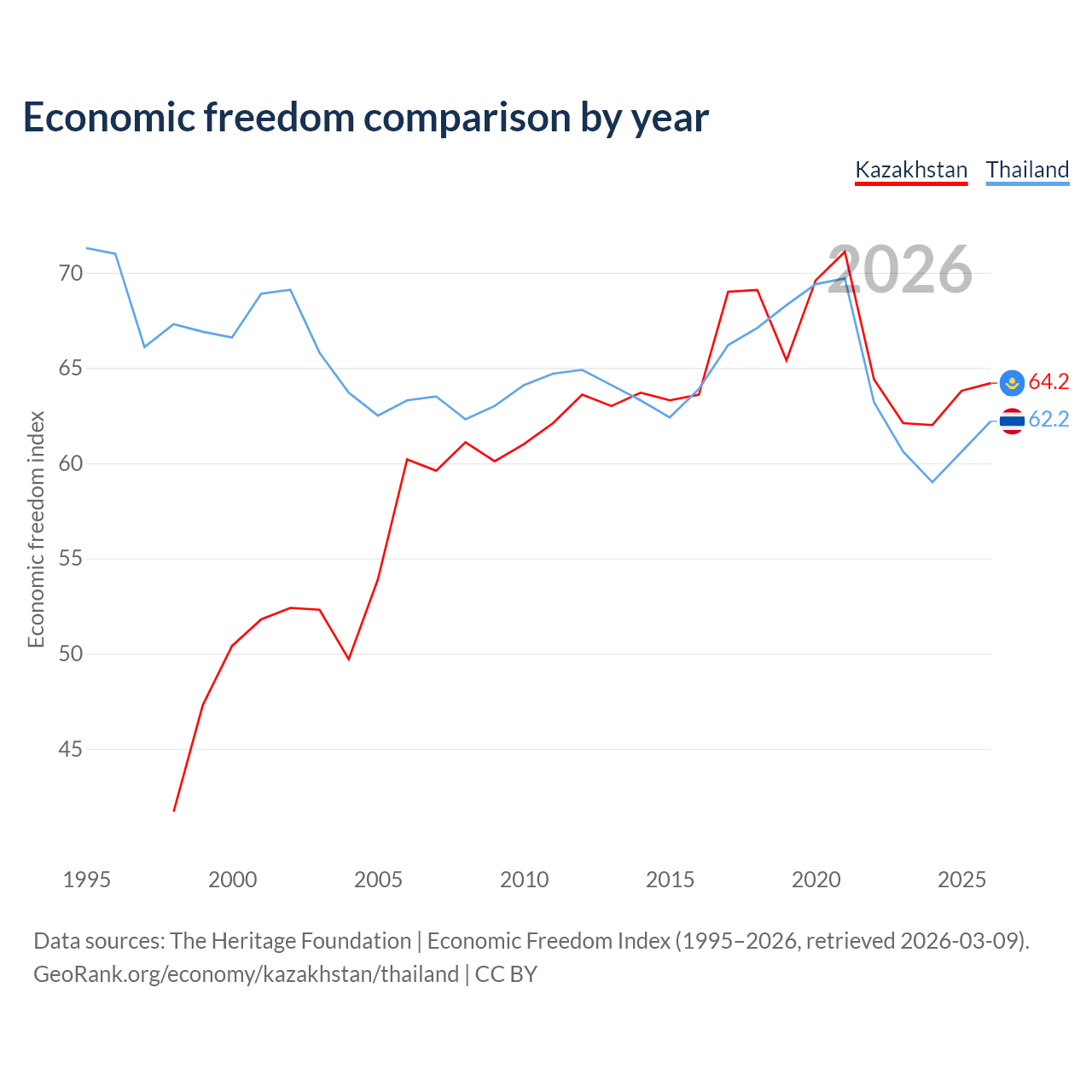 The Economic Freedom Index for Kazakhstan is 64.2, ranking 75/197, compared to 62.2 for Thailand, ranking 88/197. The chart above displays a comparison of annual changes in economic freedom indexes.