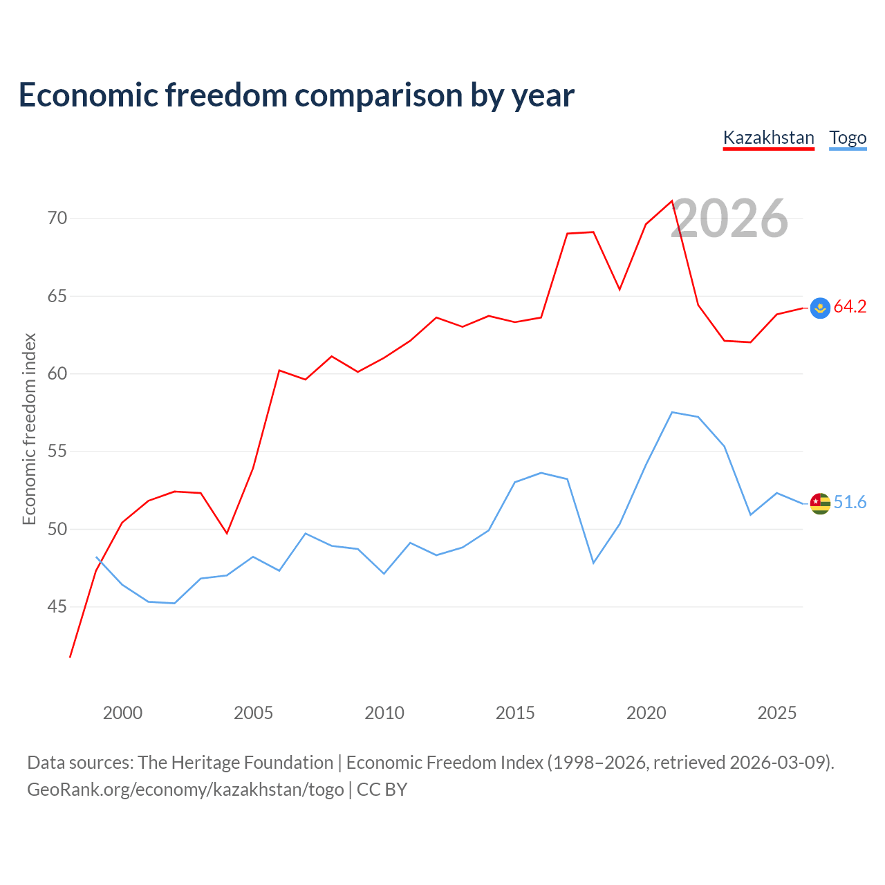 The Economic Freedom Index for Kazakhstan is 64.2, ranking 75/197, compared to 51.6 for Togo, ranking 153/197. The chart above displays a comparison of annual changes in economic freedom indexes.