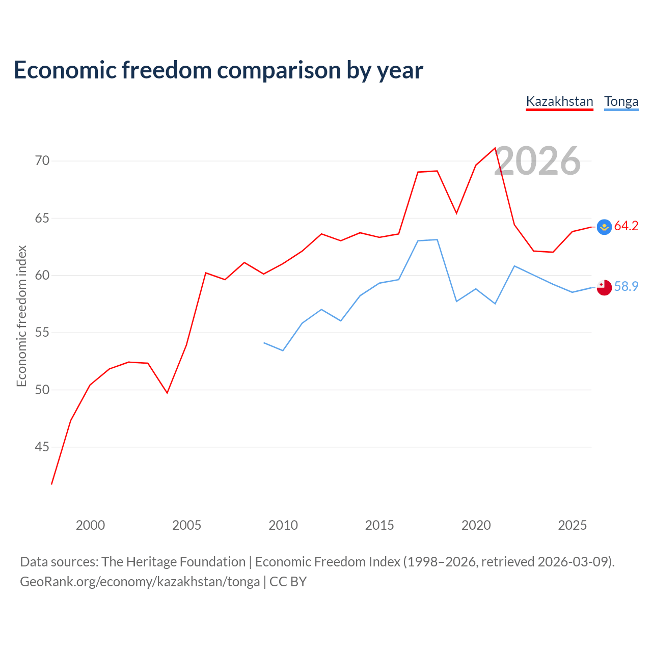 The Economic Freedom Index for Kazakhstan is 64.2, ranking 75/197, compared to 58.9 for Tonga, ranking 107/197. The chart above displays a comparison of annual changes in economic freedom indexes.