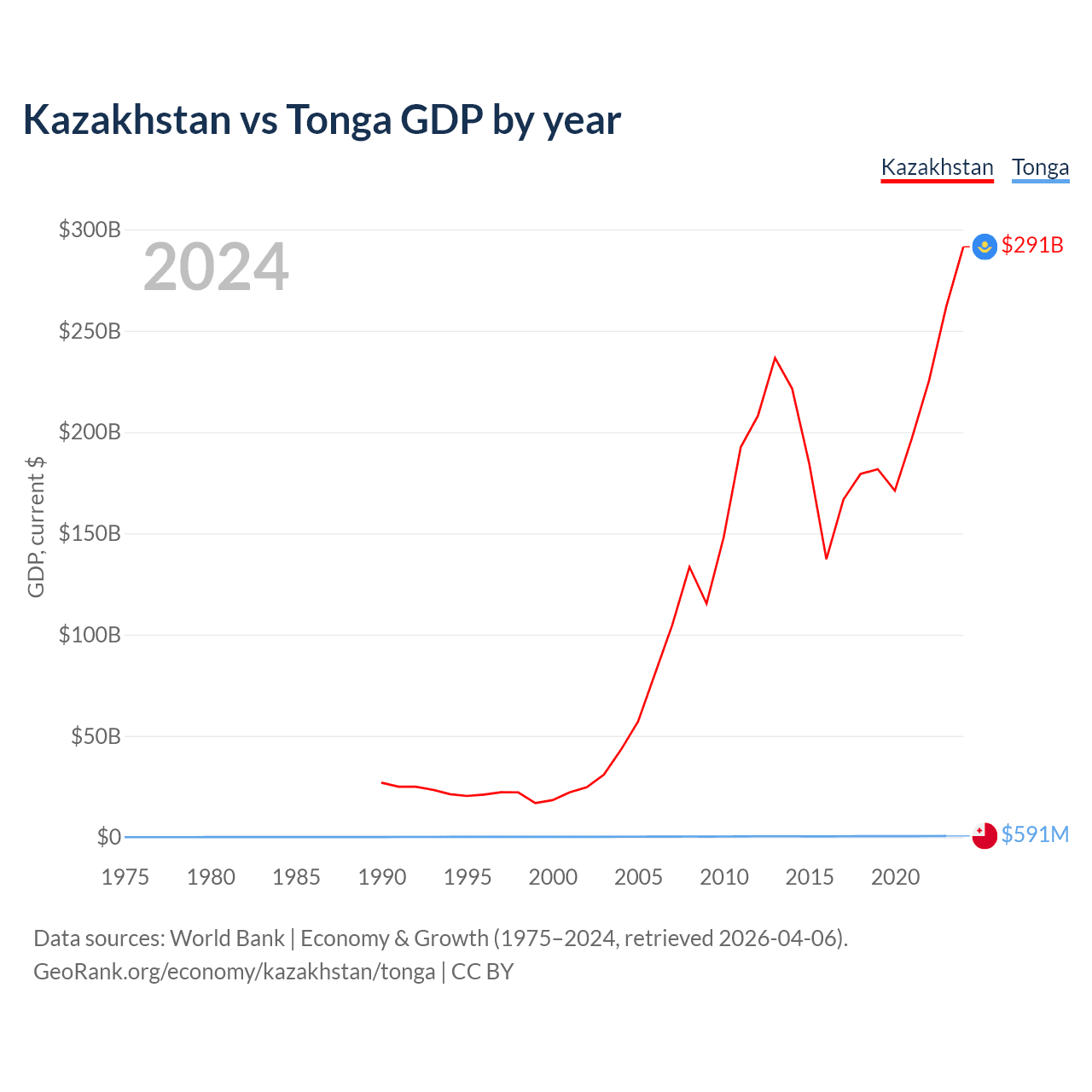 Kazakhstan has a GDP of $291B compared to $591M for Tonga, ranking 48/197 and 191/197 by economy size, respectively.