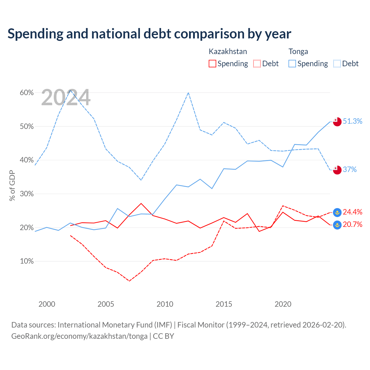 Kazakhstan has $71.1B in government debt (24.4% of GDP), compared to $256M (37% of GDP) in Tonga.