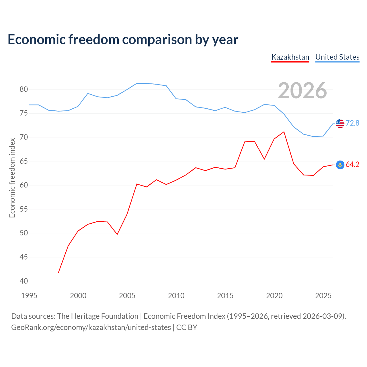 The Economic Freedom Index for Kazakhstan is 64.2, ranking 75/197, compared to 72.8 for the United States, ranking 27/197. The chart above displays a comparison of annual changes in economic freedom indexes.