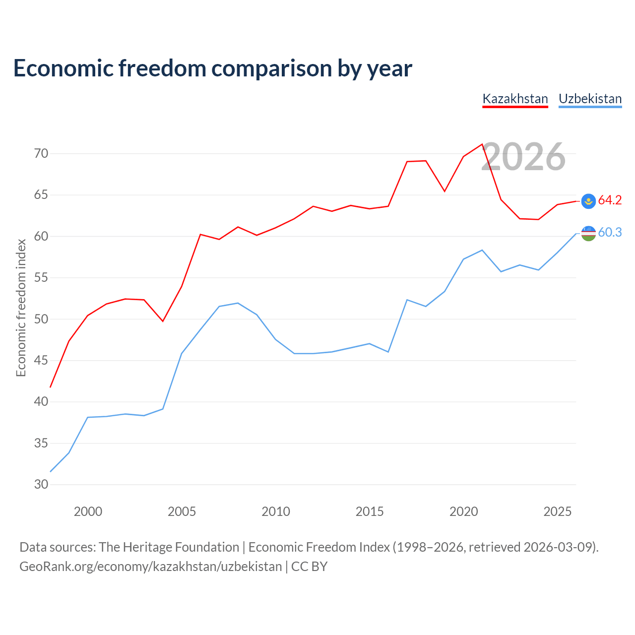 The Economic Freedom Index for Kazakhstan is 64.2, ranking 75/197, compared to 60.3 for Uzbekistan, ranking 94/197. The chart above displays a comparison of annual changes in economic freedom indexes.
