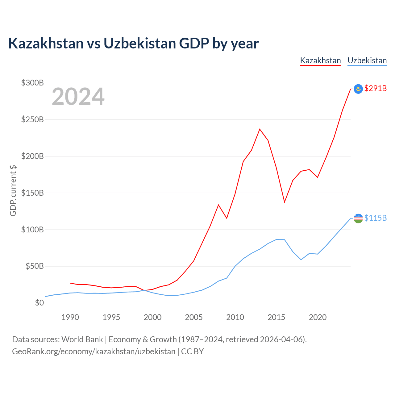 Kazakhstan has a GDP of $291B compared to $115B for Uzbekistan, ranking 48/197 and 66/197 by economy size, respectively.