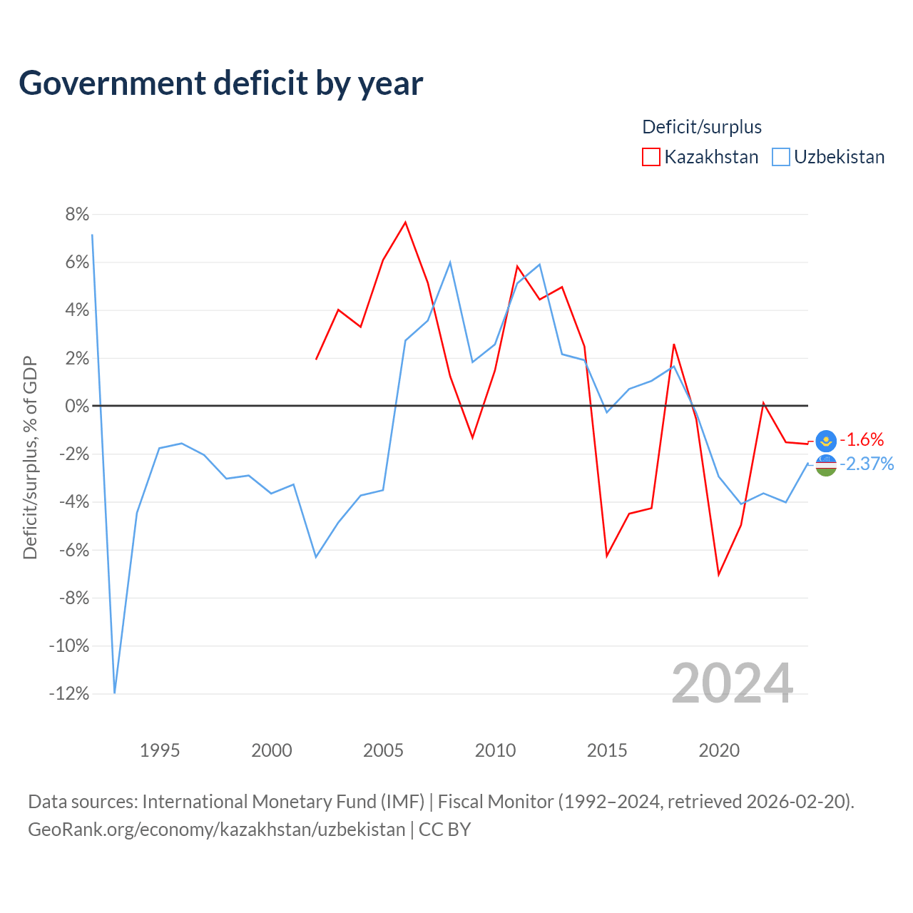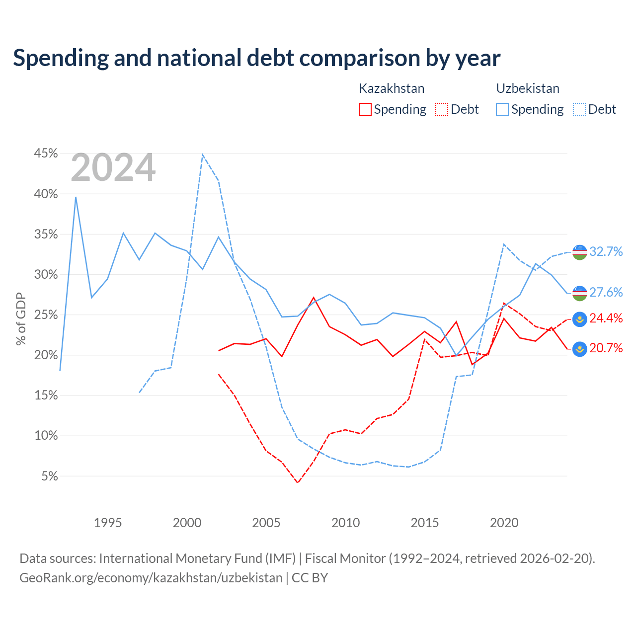 Kazakhstan has $71.1B in government debt (24.4% of GDP), compared to $37.5B (32.7% of GDP) in Uzbekistan.