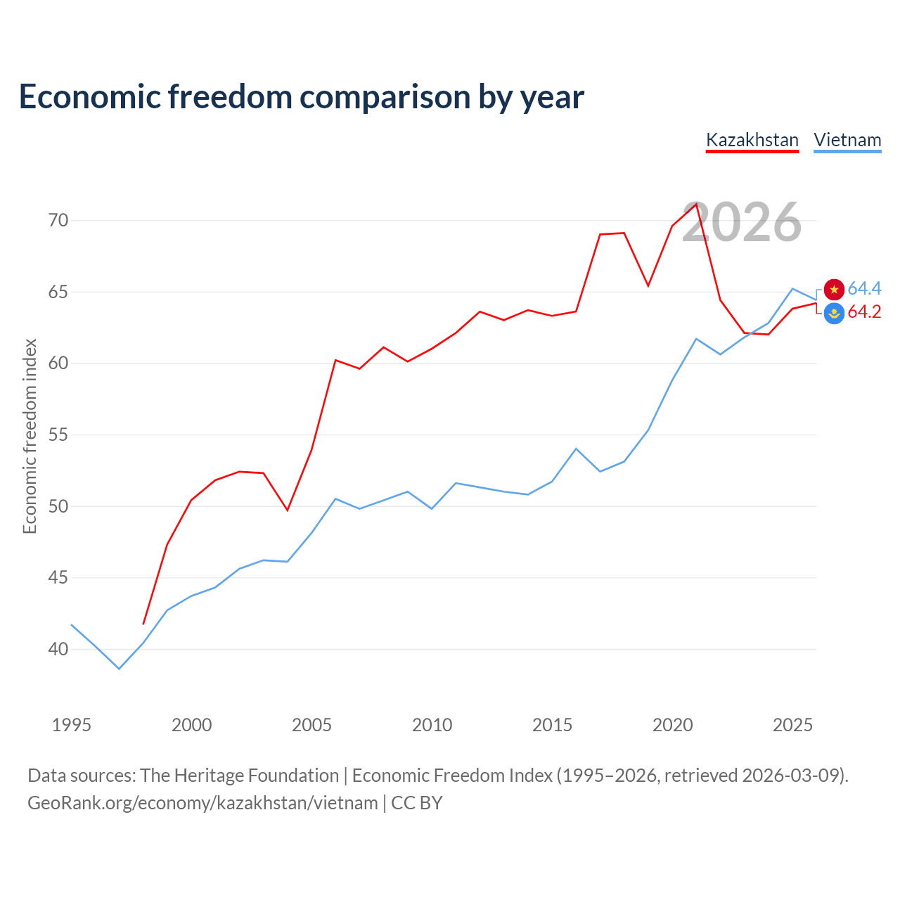 The Economic Freedom Index for Kazakhstan is 64.2, ranking 75/197, compared to 64.4 for Vietnam, ranking 73/197. The chart above displays a comparison of annual changes in economic freedom indexes.