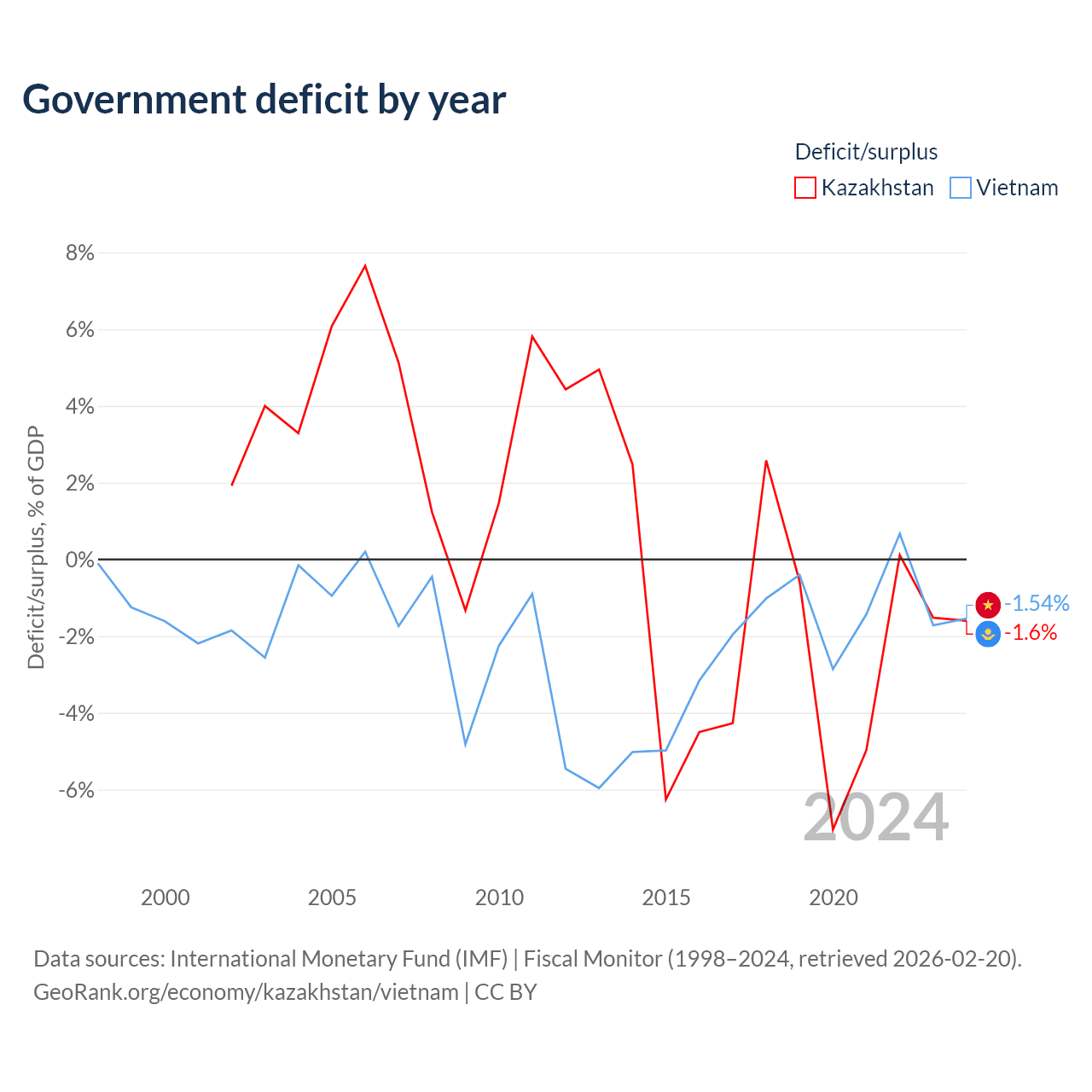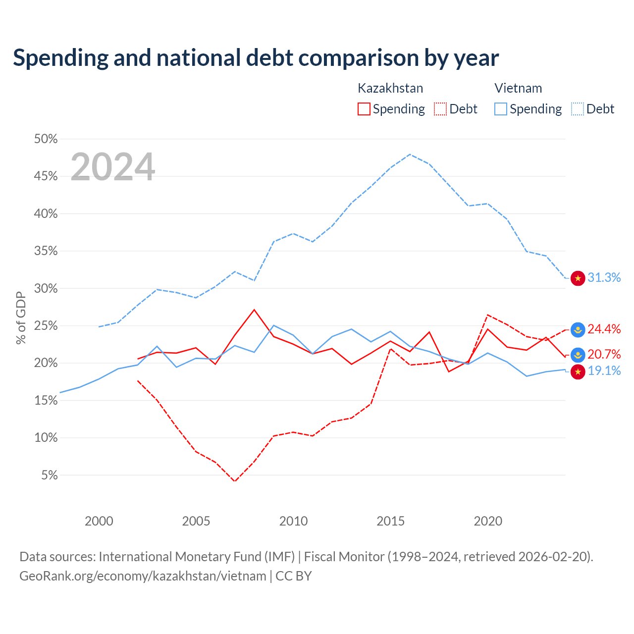 Kazakhstan has $71.1B in government debt (24.4% of GDP), compared to $149B (31.3% of GDP) in Vietnam.
