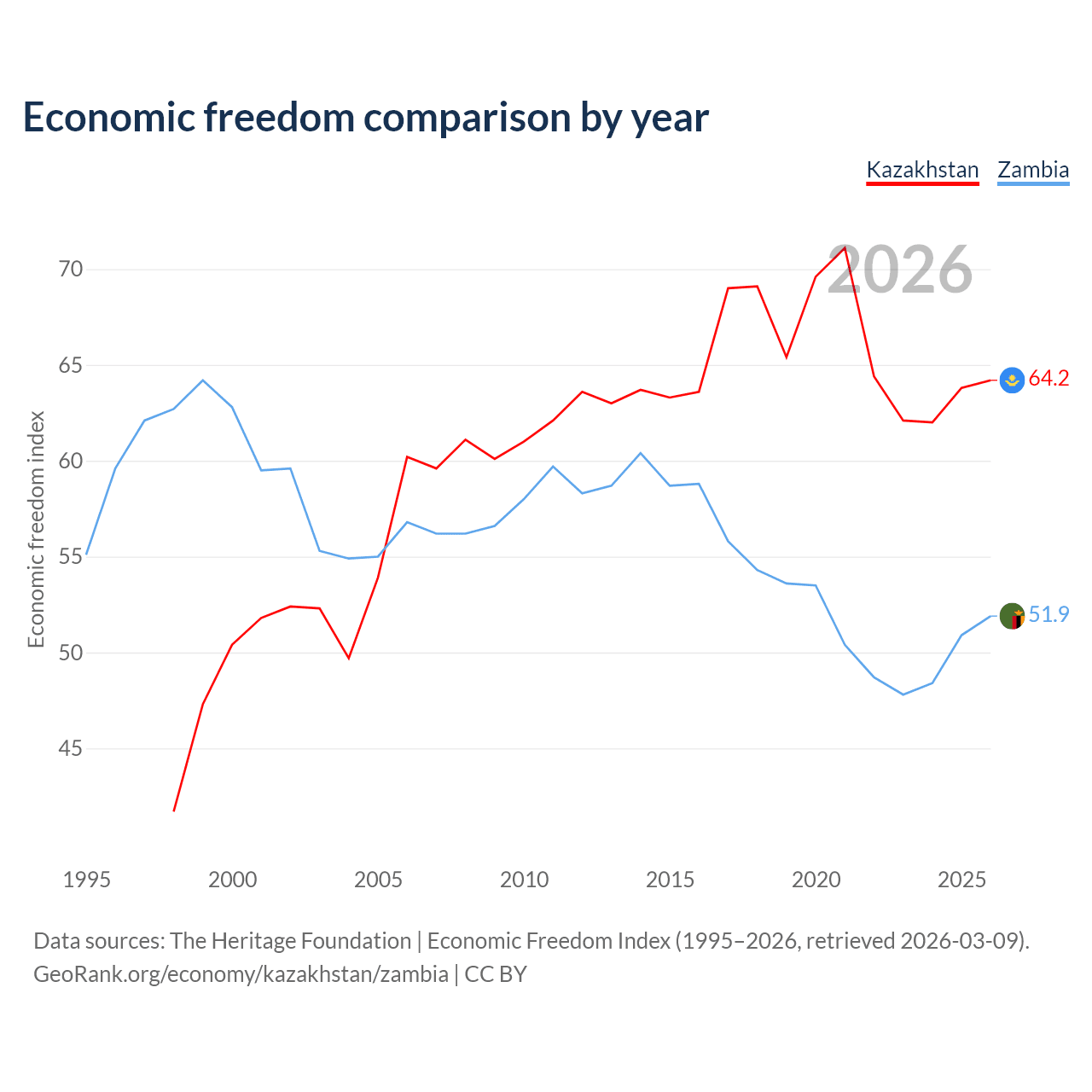 The Economic Freedom Index for Kazakhstan is 64.2, ranking 75/197, compared to 51.9 for Zambia, ranking 152/197. The chart above displays a comparison of annual changes in economic freedom indexes.