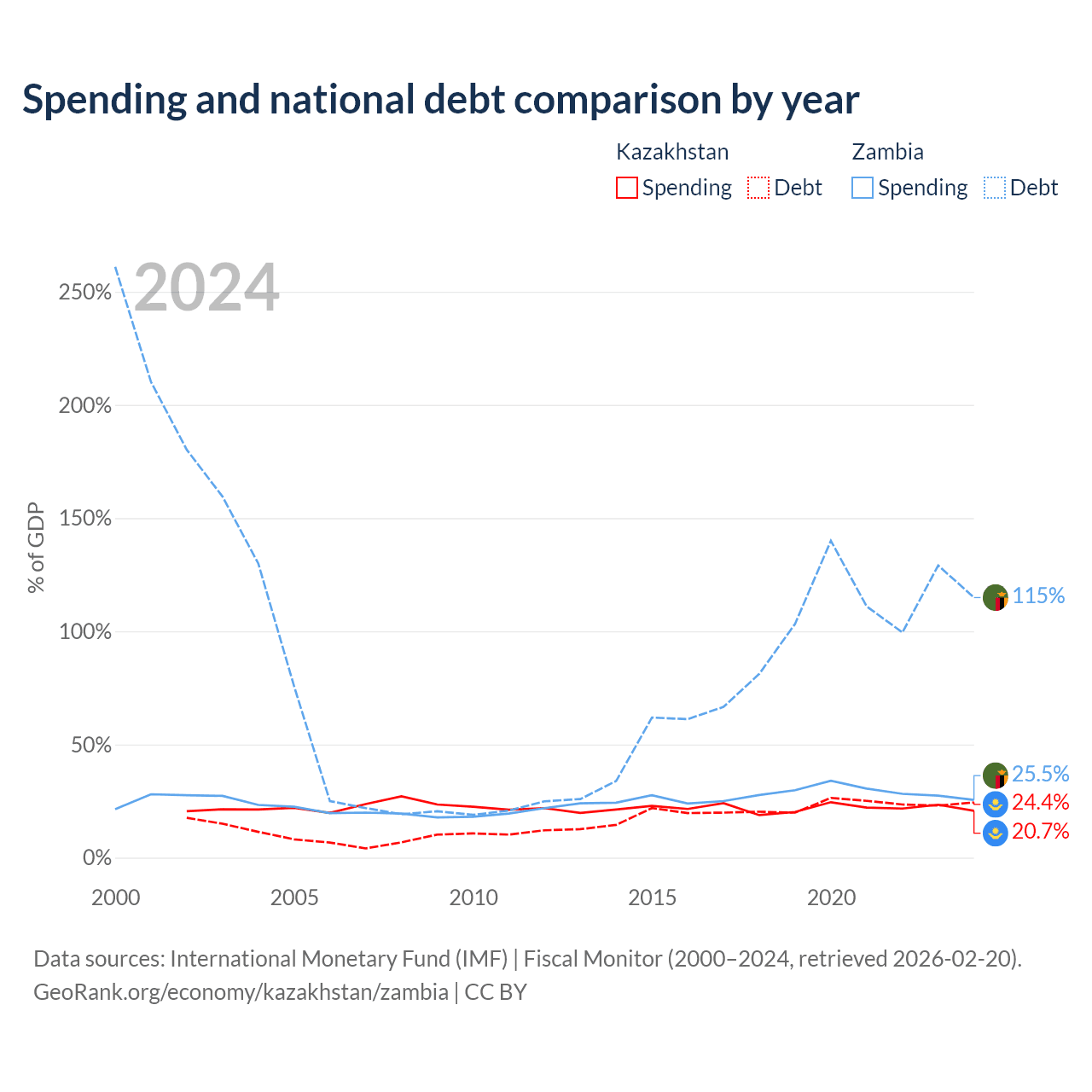 Kazakhstan has $71.1B in government debt (24.4% of GDP), compared to $29.1B (114.9% of GDP) in Zambia.