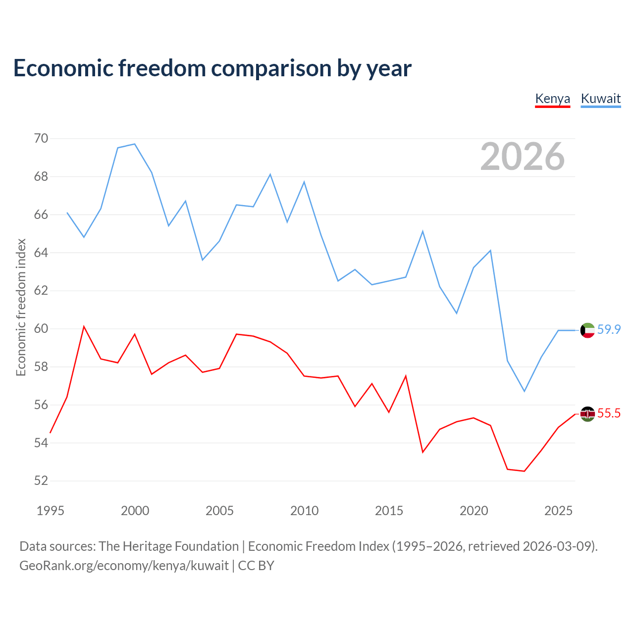 The Economic Freedom Index for Kenya is 55.5, ranking 128/197, compared to 59.9 for Kuwait, ranking 100/197. The chart above displays a comparison of annual changes in economic freedom indexes.
