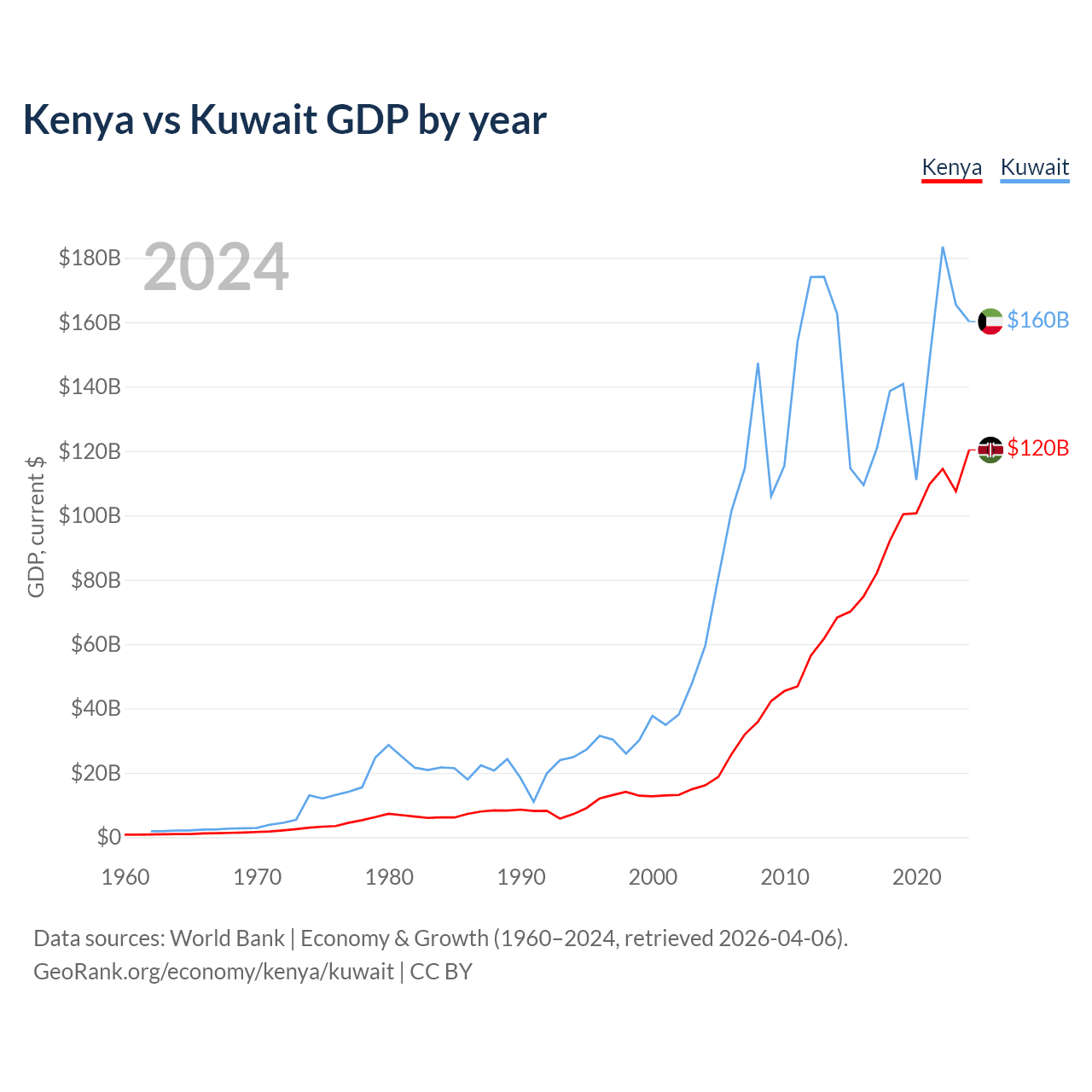 Kenya has a GDP of $120B compared to $160B for Kuwait, ranking 64/197 and 59/197 by economy size, respectively.