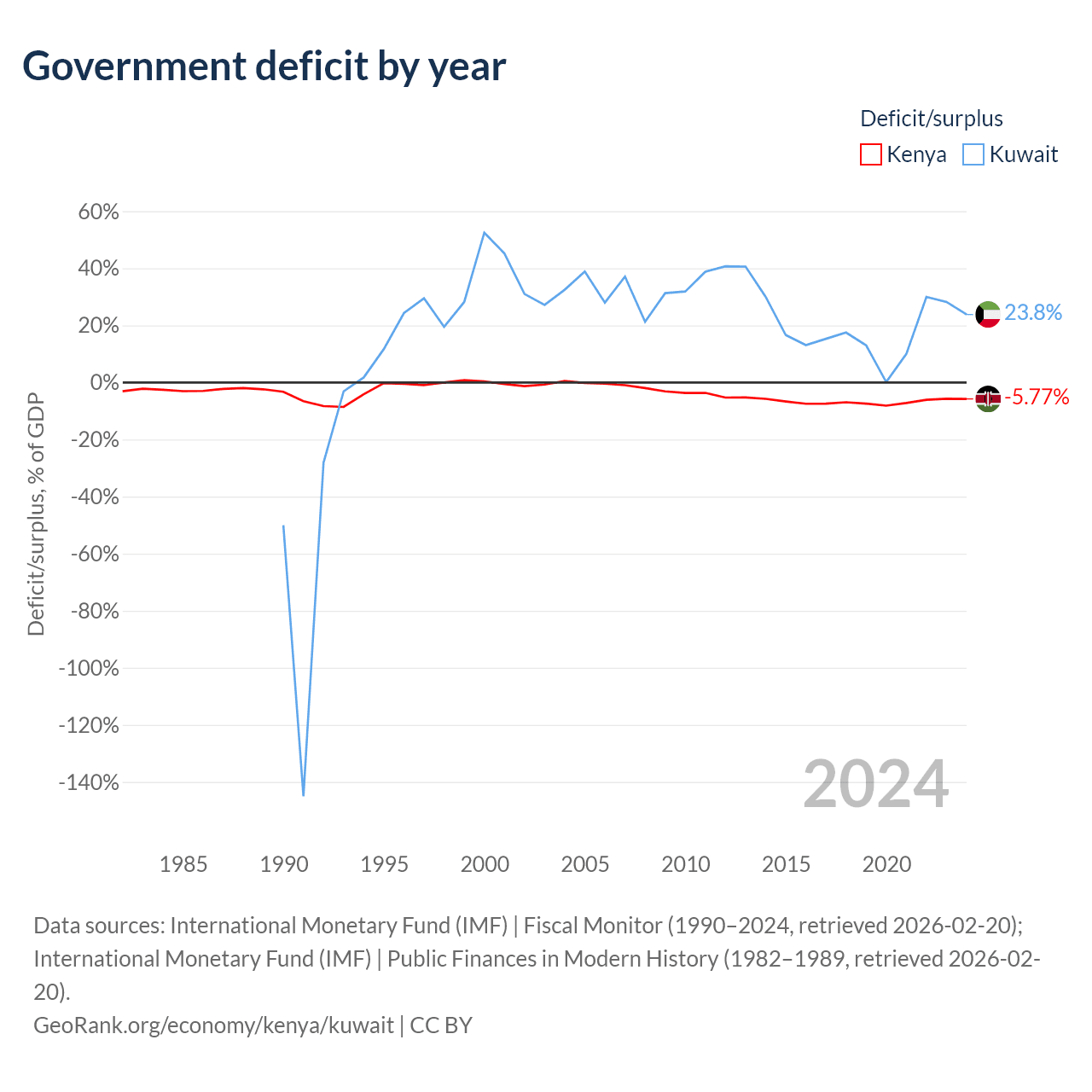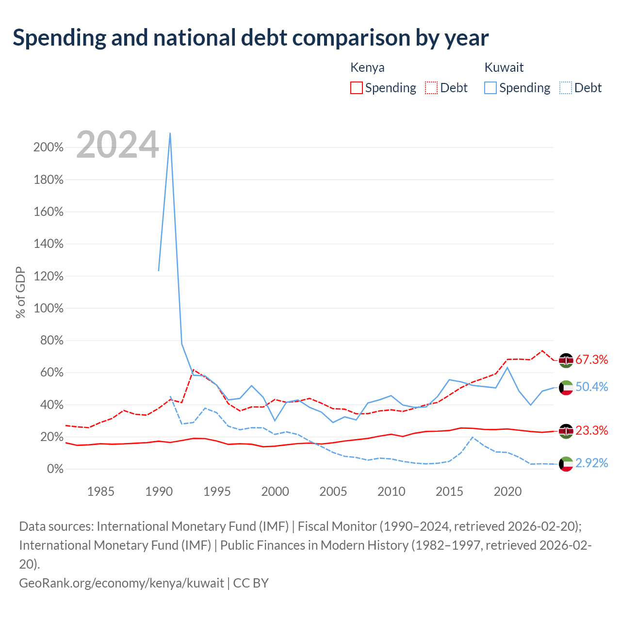 Kenya has $81B in government debt (67.3% of GDP), compared to $4.68B (2.92% of GDP) in Kuwait.
