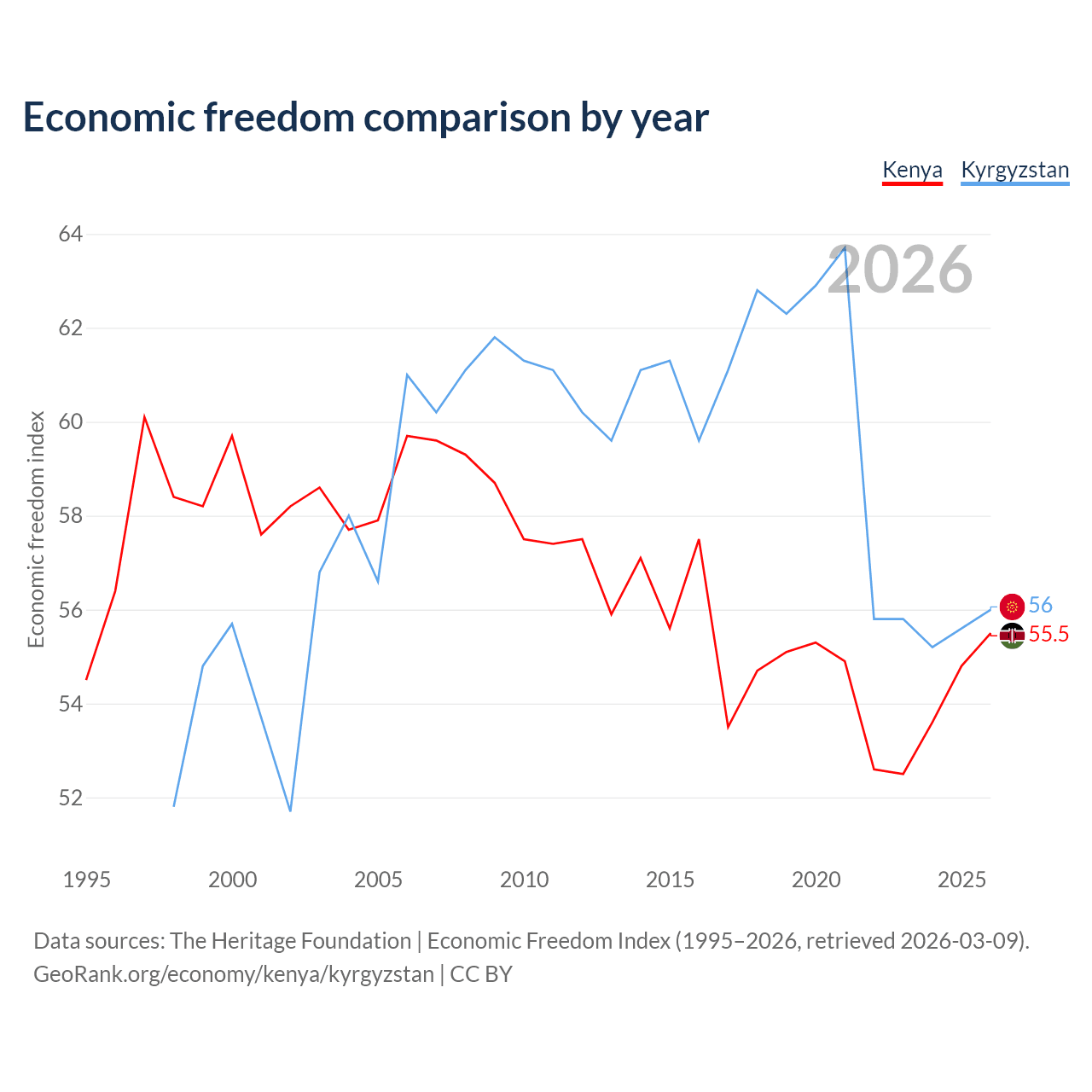 The Economic Freedom Index for Kenya is 55.5, ranking 128/197, compared to 56 for Kyrgyzstan, ranking 126/197. The chart above displays a comparison of annual changes in economic freedom indexes.