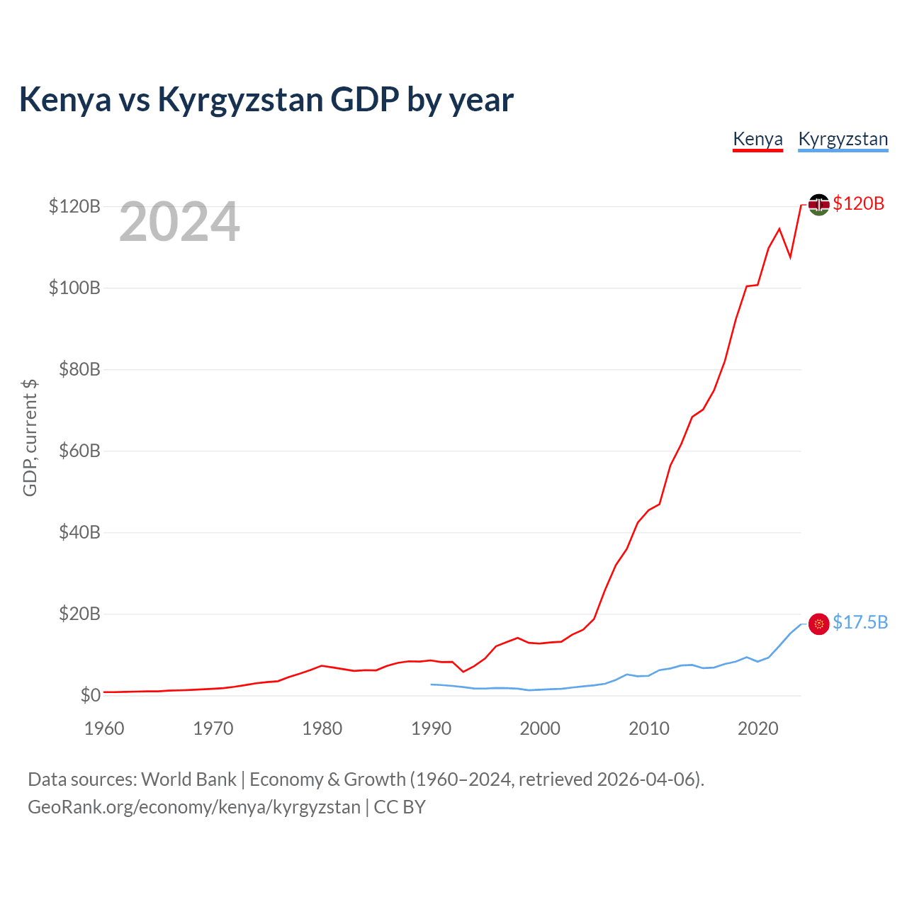 Kenya has a GDP of $120B compared to $17.5B for Kyrgyzstan, ranking 64/197 and 135/197 by economy size, respectively.