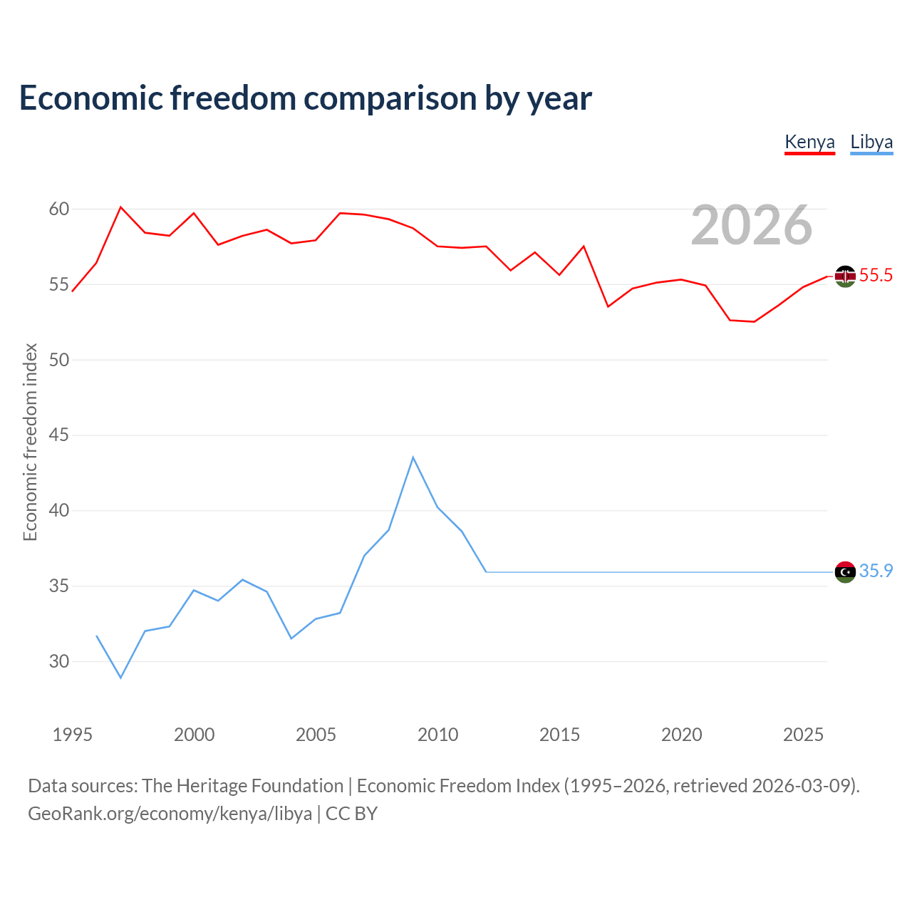 The Economic Freedom Index for Kenya is 55.5, ranking 128/197, compared to 35.9 for Libya, ranking 189/197. The chart above displays a comparison of annual changes in economic freedom indexes.