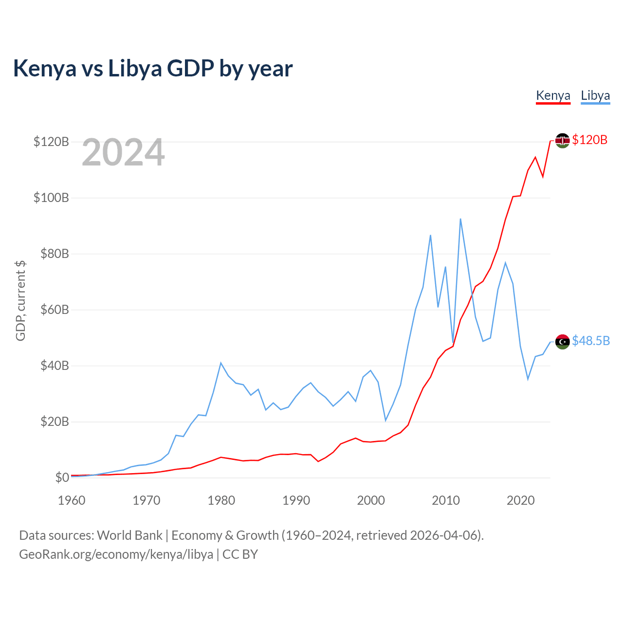 Kenya has a GDP of $120B compared to $48.5B for Libya, ranking 64/197 and 95/197 by economy size, respectively.