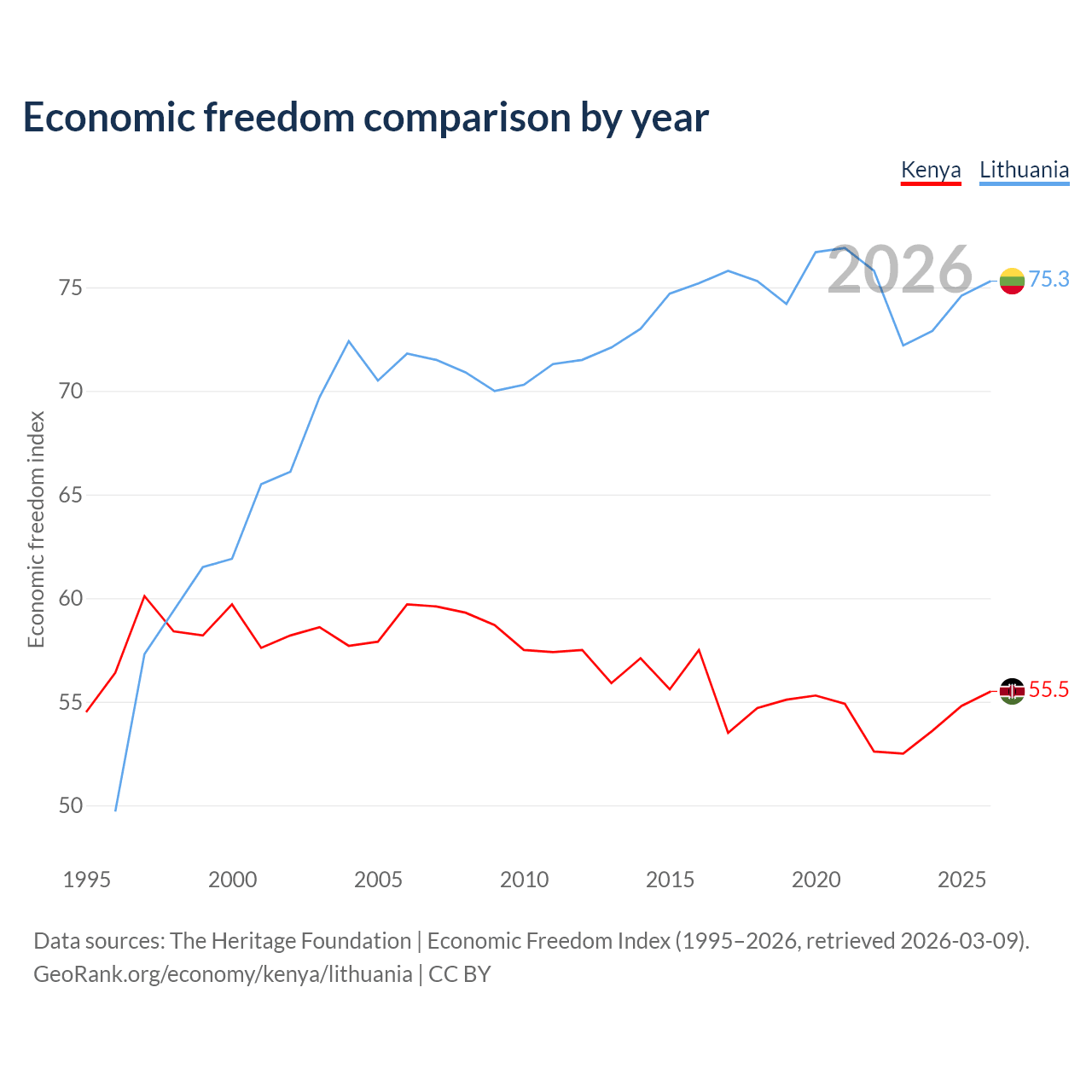 The Economic Freedom Index for Kenya is 55.5, ranking 128/197, compared to 75.3 for Lithuania, ranking 18/197. The chart above displays a comparison of annual changes in economic freedom indexes.