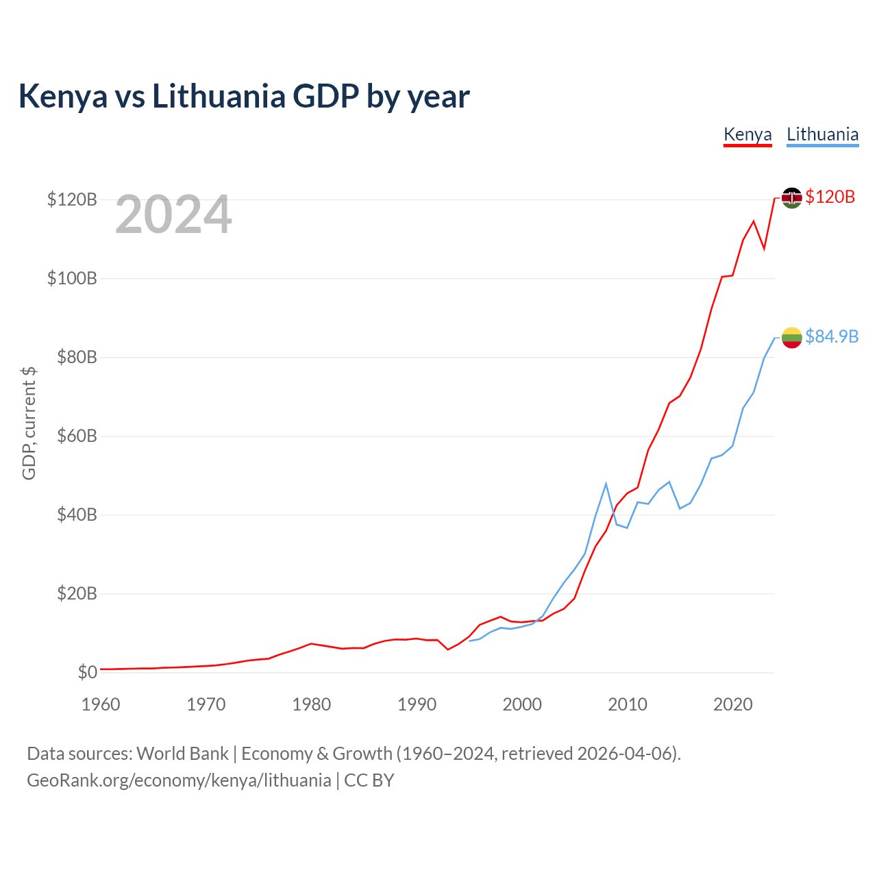 Kenya has a GDP of $120B compared to $84.9B for Lithuania, ranking 64/197 and 79/197 by economy size, respectively.