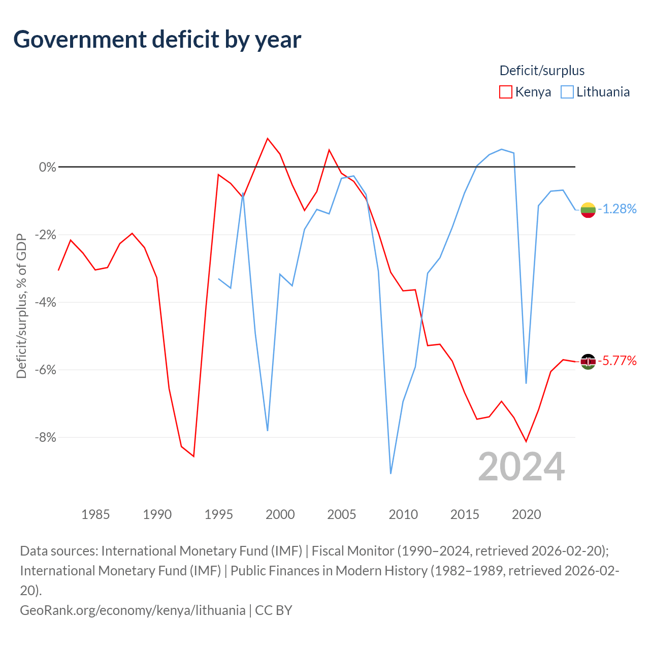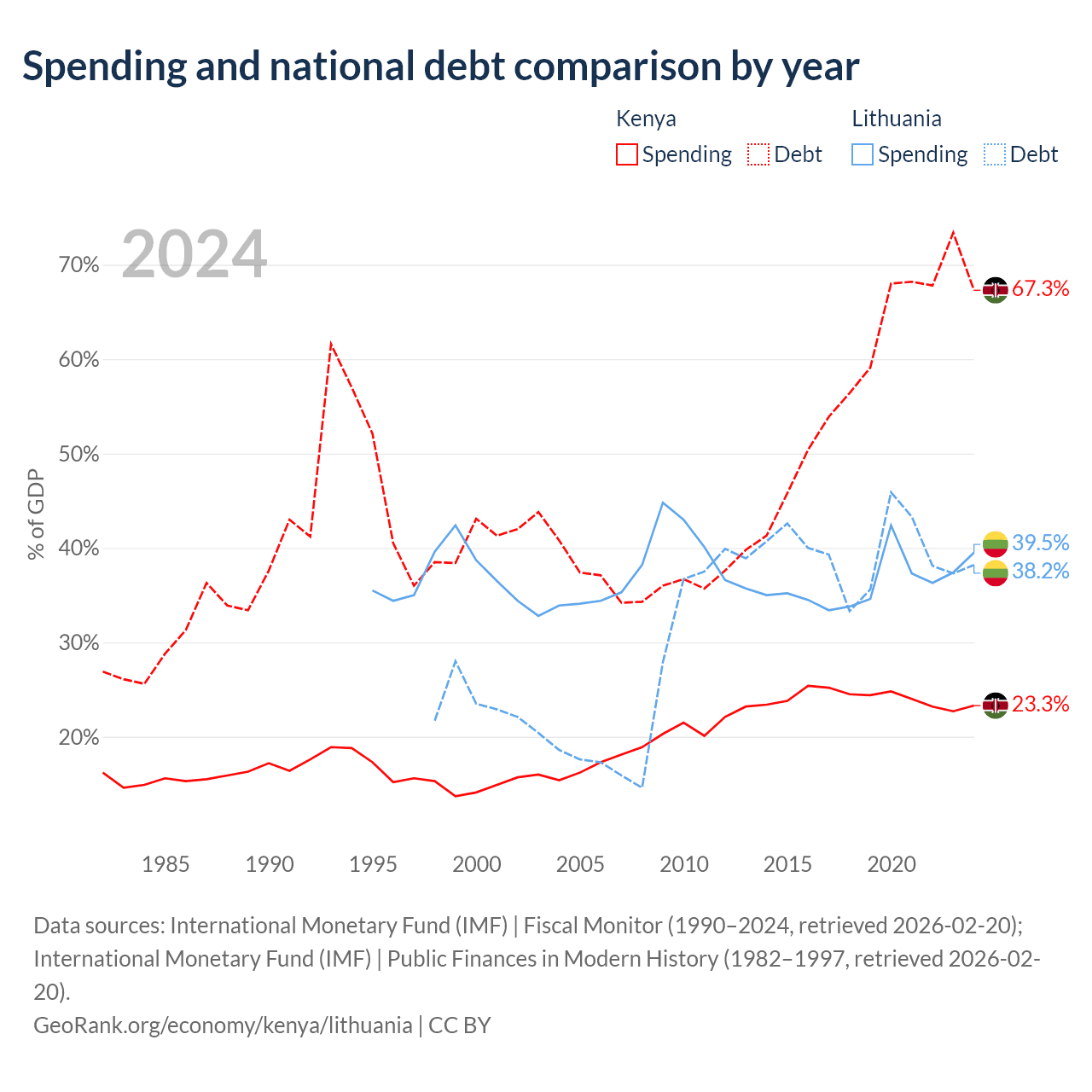 Kenya has $81B in government debt (67.3% of GDP), compared to $32.4B (38.2% of GDP) in Lithuania.