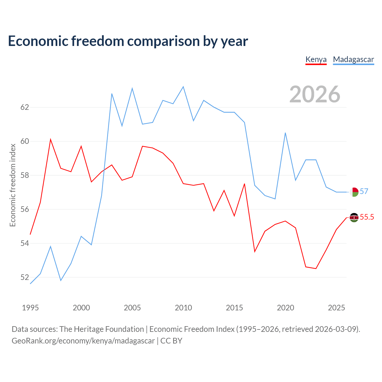 The Economic Freedom Index for Kenya is 55.5, ranking 128/197, compared to 57 for Madagascar, ranking 119/197. The chart above displays a comparison of annual changes in economic freedom indexes.