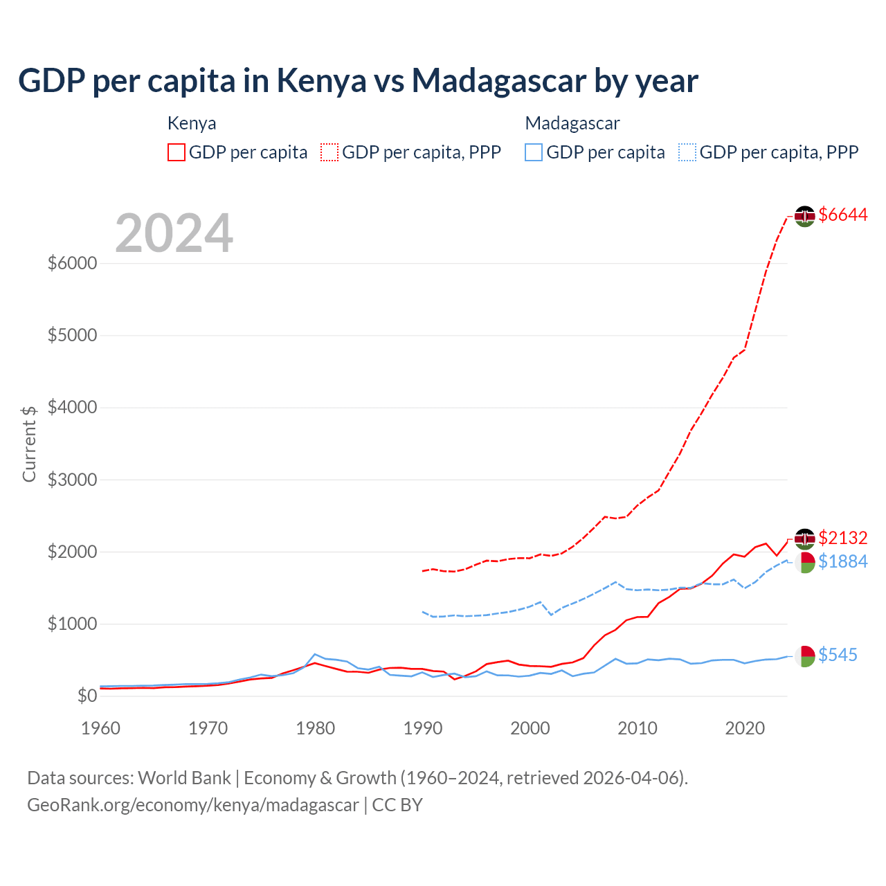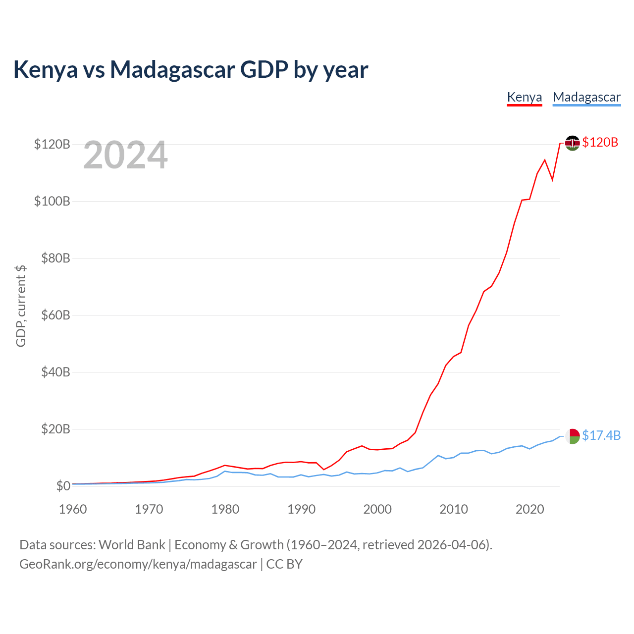 Kenya has a GDP of $120B compared to $17.4B for Madagascar, ranking 64/197 and 136/197 by economy size, respectively.