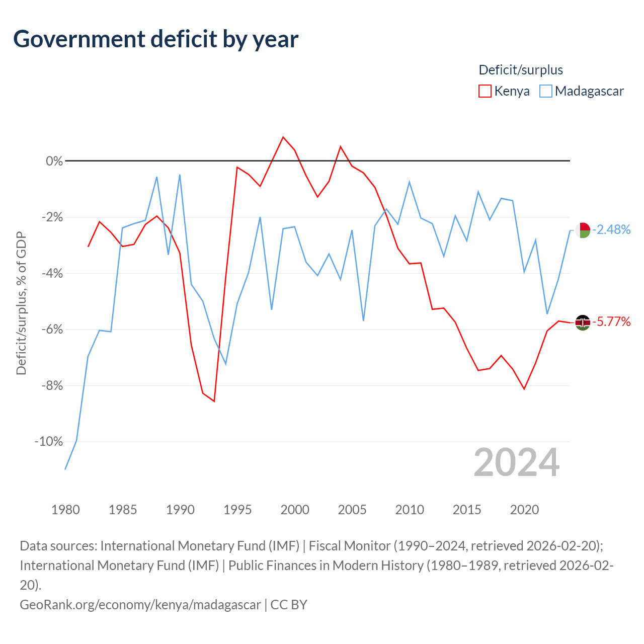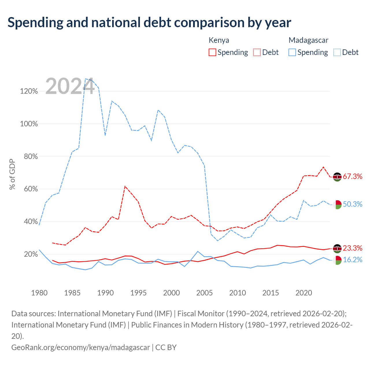 Kenya has $81B in government debt (67.3% of GDP), compared to $8.77B (50.3% of GDP) in Madagascar.