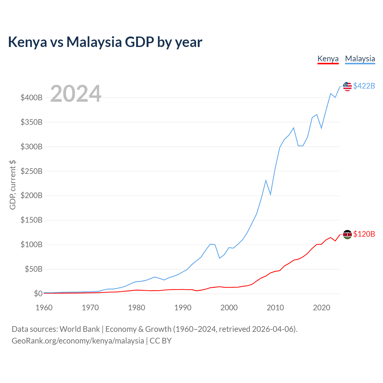 Kenya has a GDP of $120B compared to $422B for Malaysia, ranking 64/197 and 38/197 by economy size, respectively.
