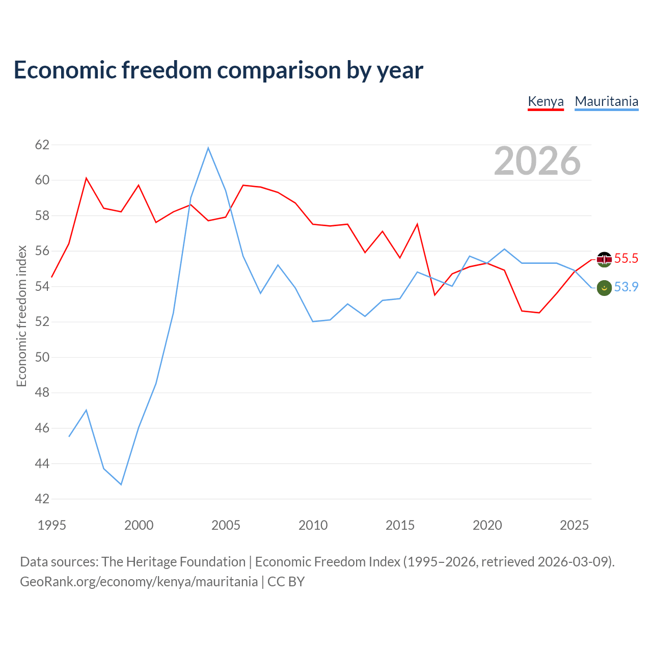 The Economic Freedom Index for Kenya is 55.5, ranking 128/197, compared to 53.9 for Mauritania, ranking 136/197. The chart above displays a comparison of annual changes in economic freedom indexes.