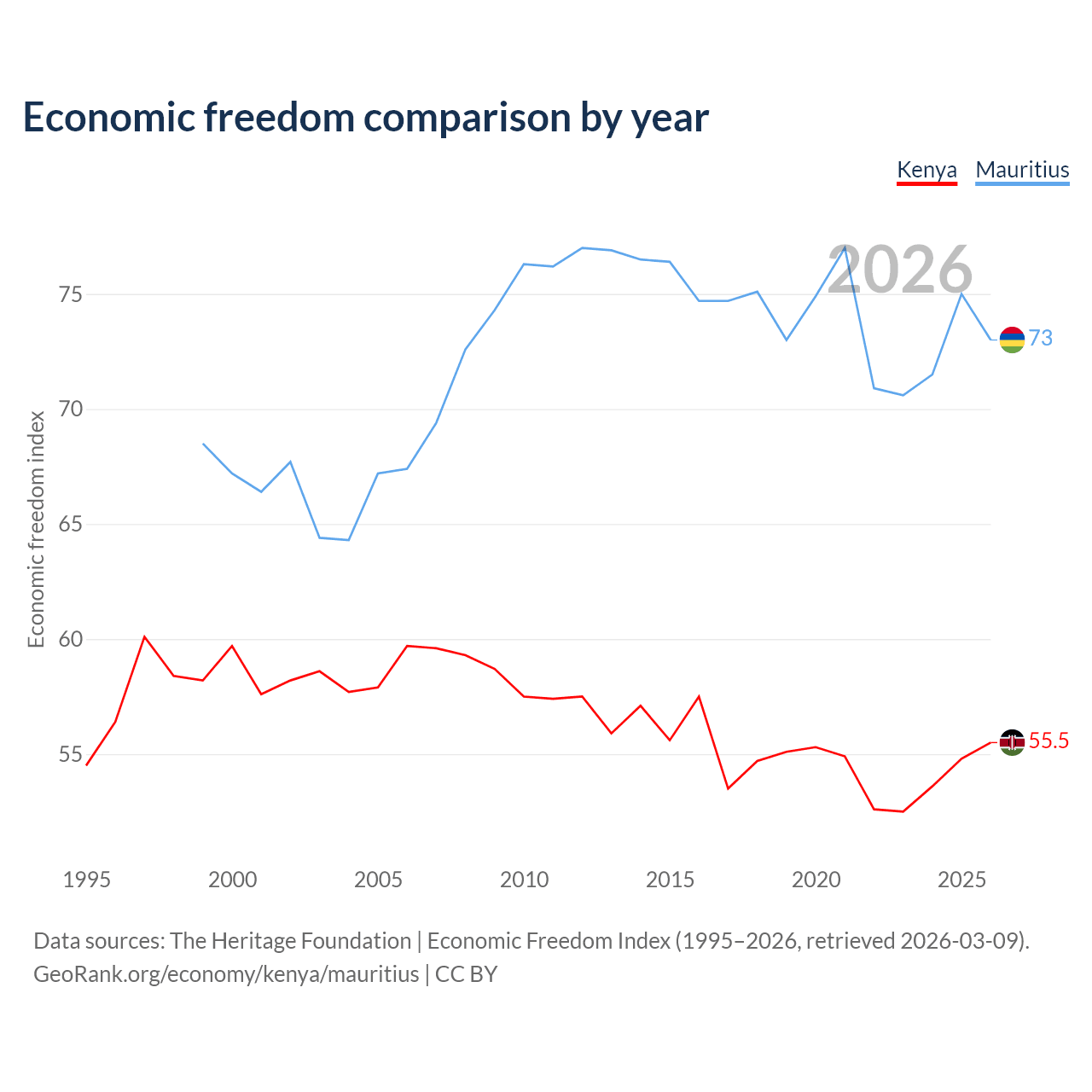 The Economic Freedom Index for Kenya is 55.5, ranking 128/197, compared to 73 for Mauritius, ranking 26/197. The chart above displays a comparison of annual changes in economic freedom indexes.