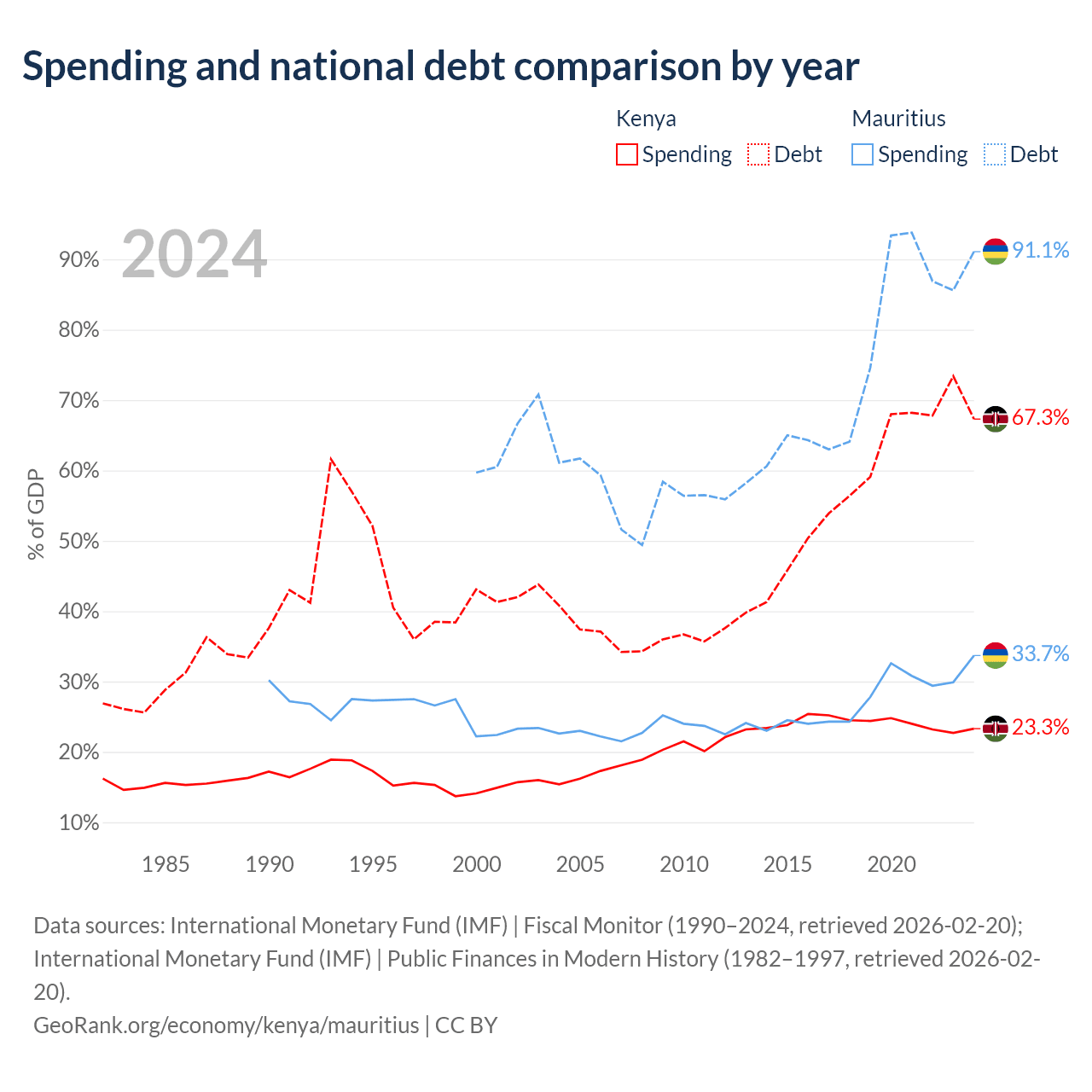 Kenya has $81B in government debt (67.3% of GDP), compared to $13.6B (91.1% of GDP) in Mauritius.