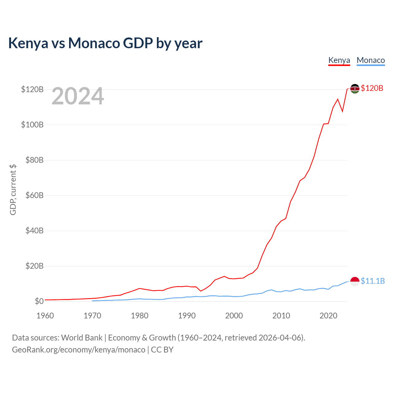 Kenya has a GDP of $120B compared to $11.1B for Monaco, ranking 64/197 and 152/197 by economy size, respectively.