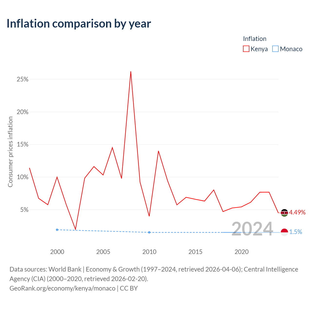 Over the past 21 years, Kenya has recorded an average annual inflation rate of 8.82%, compared with 1.58% in Monaco. In 2020, inflation was 4.49% in Kenya and 1.5% in Monaco.