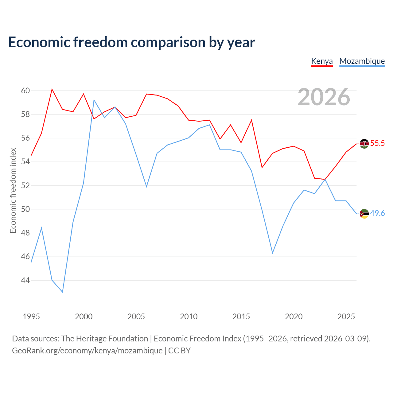 The Economic Freedom Index for Kenya is 55.5, ranking 128/197, compared to 49.6 for Mozambique, ranking 164/197. The chart above displays a comparison of annual changes in economic freedom indexes.