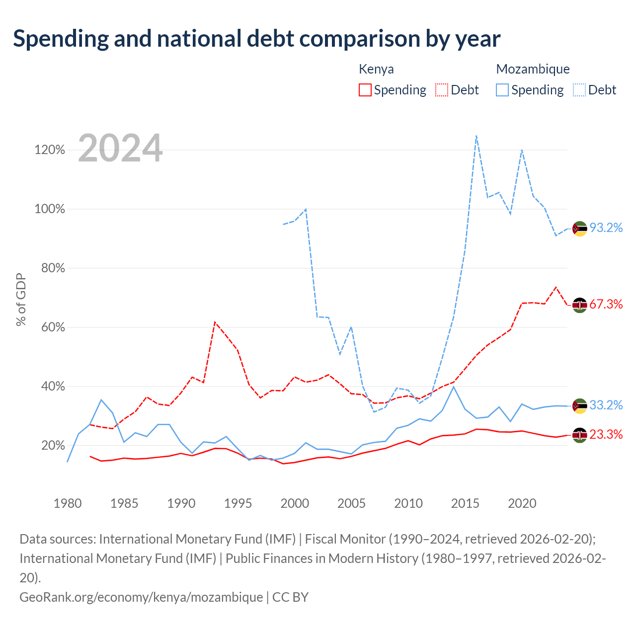 Kenya has $81B in government debt (67.3% of GDP), compared to $21.2B (93.2% of GDP) in Mozambique.
