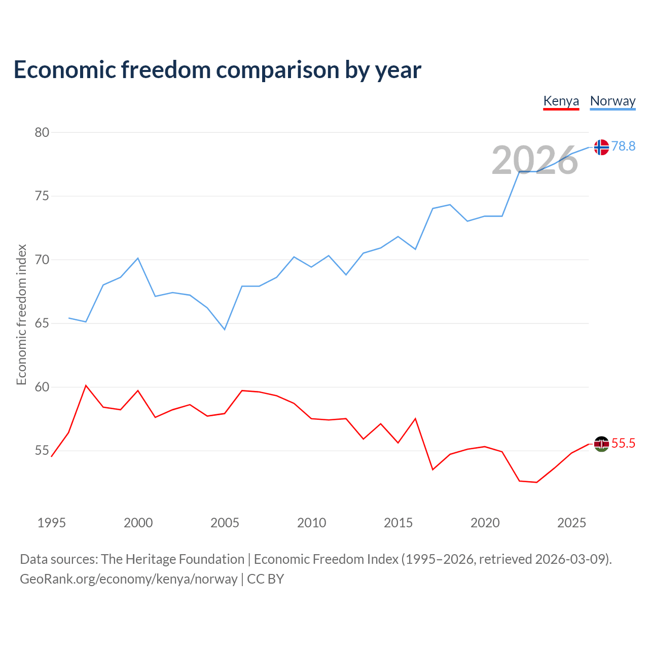 The Economic Freedom Index for Kenya is 55.5, ranking 128/197, compared to 78.8 for Norway, ranking 9/197. The chart above displays a comparison of annual changes in economic freedom indexes.