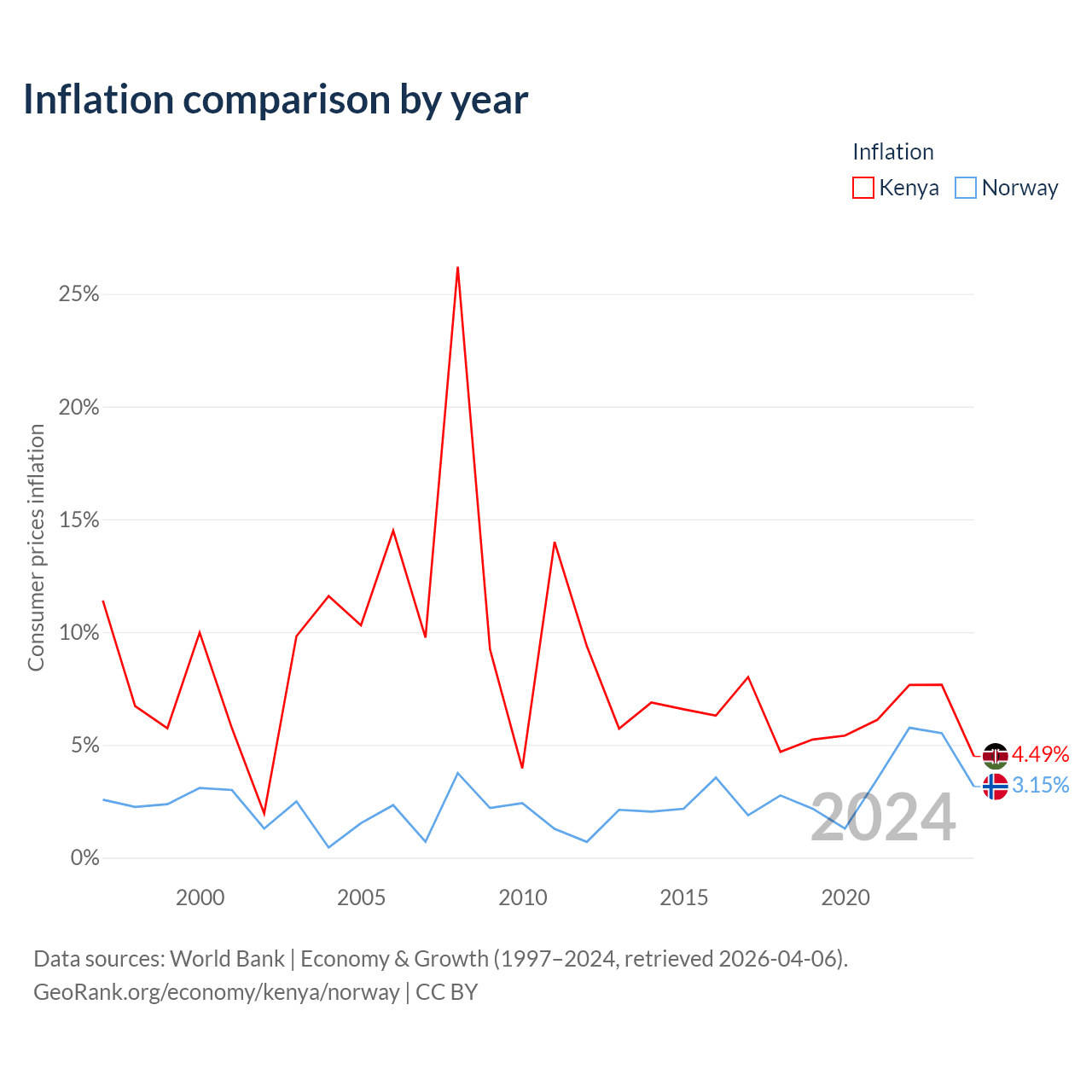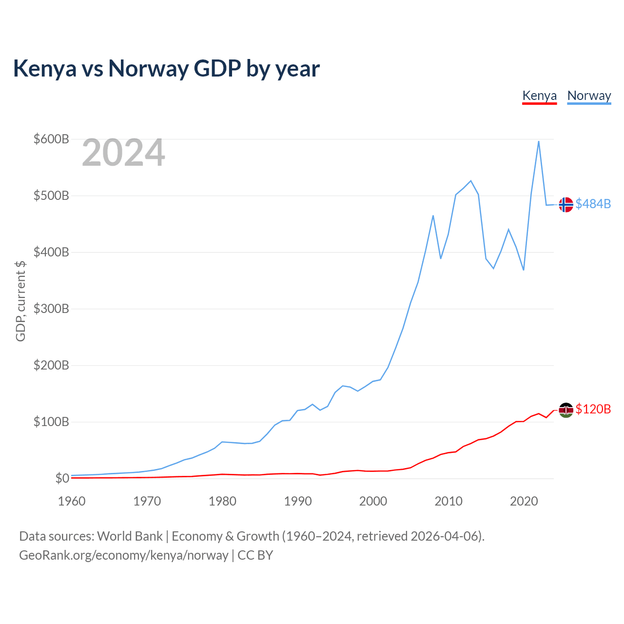 Kenya has a GDP of $120B compared to $484B for Norway, ranking 64/197 and 32/197 by economy size, respectively.