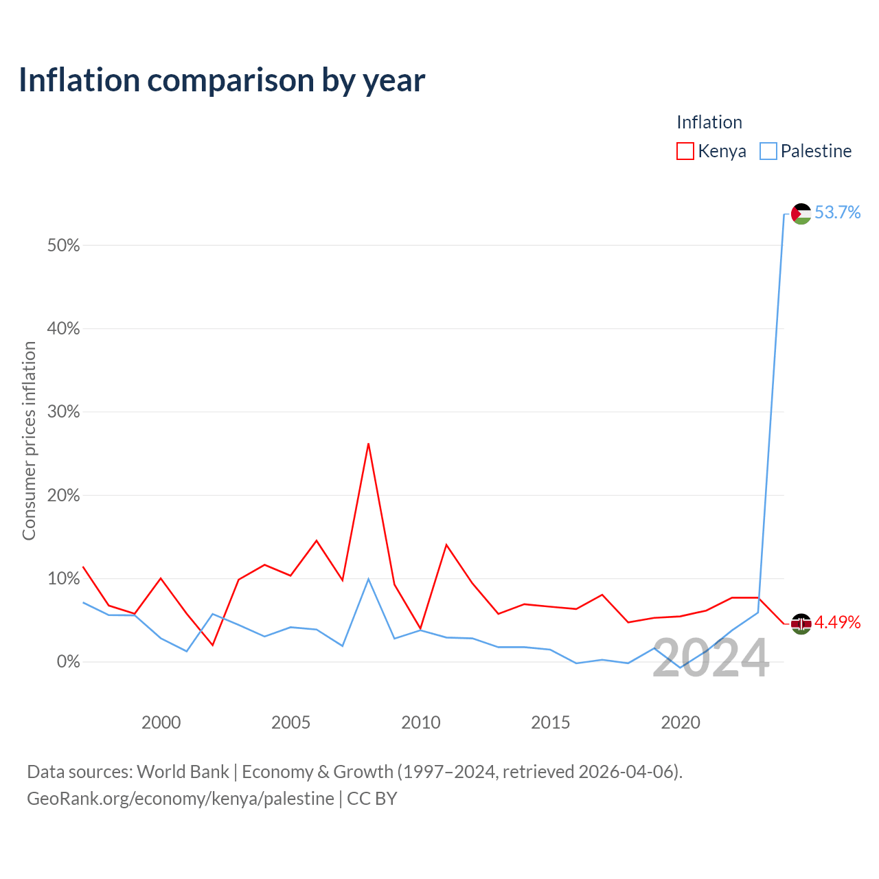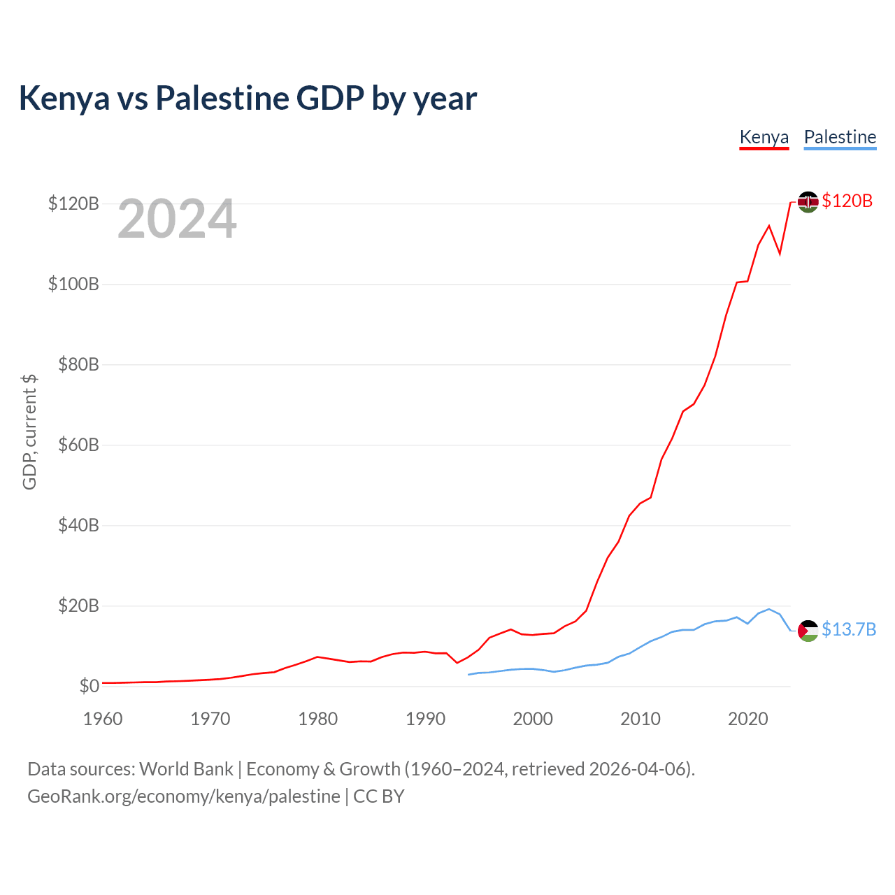 Kenya has a GDP of $120B compared to $13.7B for Palestine, ranking 64/197 and 146/197 by economy size, respectively.