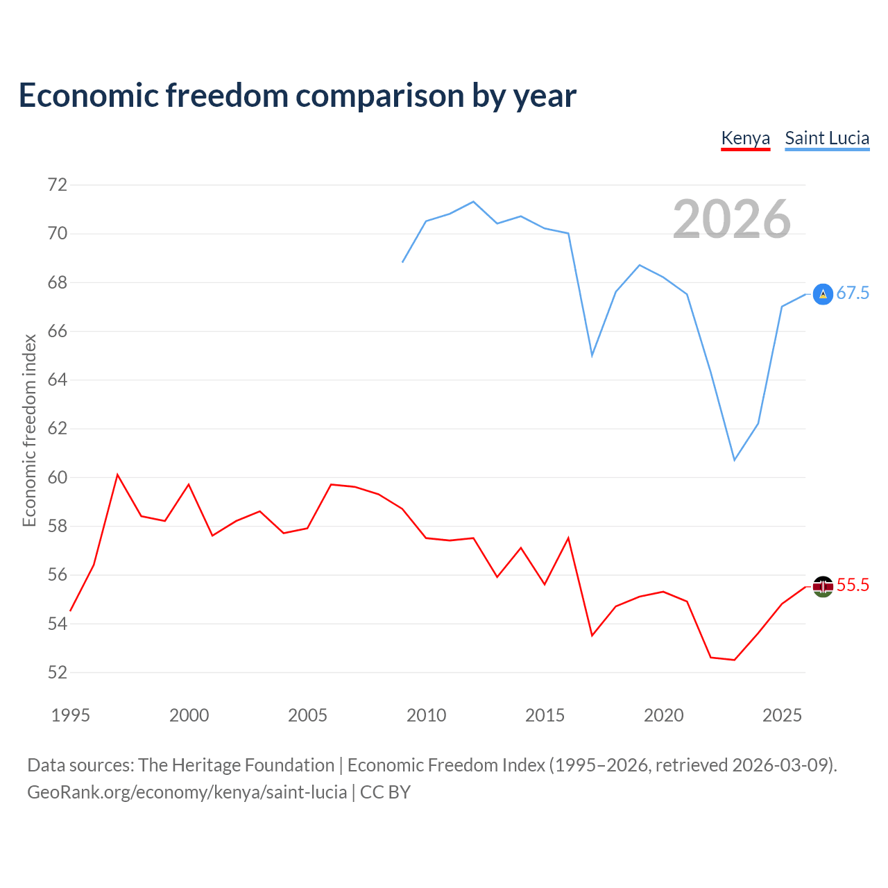 The Economic Freedom Index for Kenya is 55.5, ranking 128/197, compared to 67.5 for Saint Lucia, ranking 57/197. The chart above displays a comparison of annual changes in economic freedom indexes.