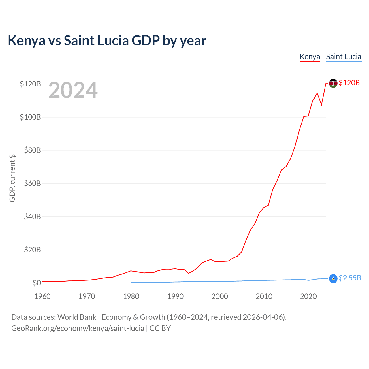 Kenya has a GDP of $120B compared to $2.55B for Saint Lucia, ranking 64/197 and 173/197 by economy size, respectively.